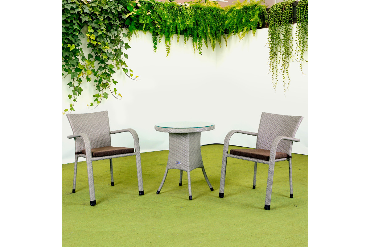 Комплект садових меблів Greengard Терра — стильний та сучасний набір для двох, виконаний із штучного ротангу. Ідеально підходить для облаштування затишного балкона, тераси чи невеликої зони відпочинку. Ергономічні стільці з підлокітниками забезпечують комфорт, повторюючи природне положення тіла. Скляна стільниця столика надійно закріплена та має гладку поверхню. Усі елементи комплекту мають металевий каркас із полімерним покриттям, що гарантує міцність і довговічність. За бажанням комплект може бути доповнений м’якими подушками.