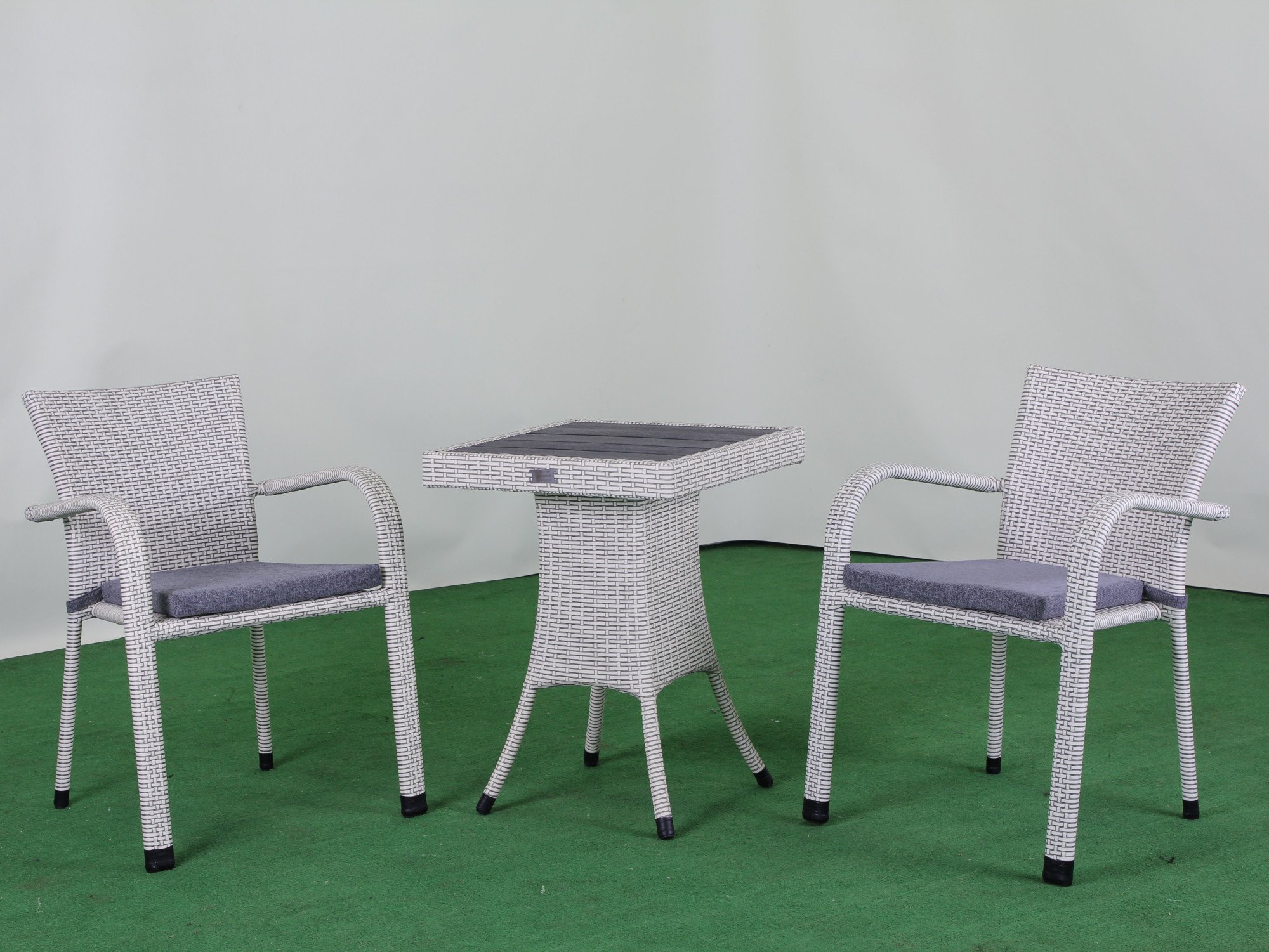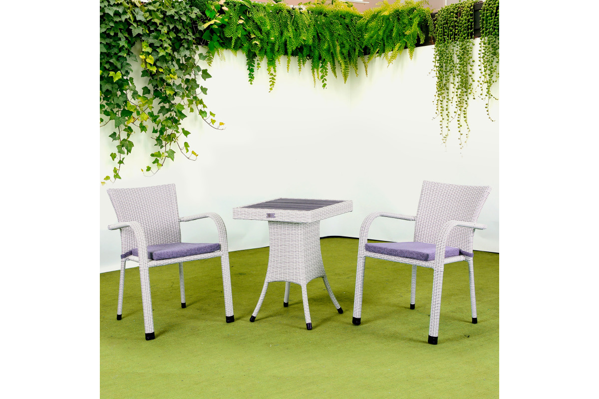 Комплект садових меблів Greengard Терра — стильне та сучасне рішення для облаштування затишного балкона чи невеликої зони відпочинку. Набір складається зі столу та двох стільців із підлокітниками. Штучний ротанг забезпечує легкість та привабливий вигляд, а стільниця з терасної дошки додає практичності та стійкості до щоденного використання. Металевий каркас гарантує надійність конструкцій і довговічність.