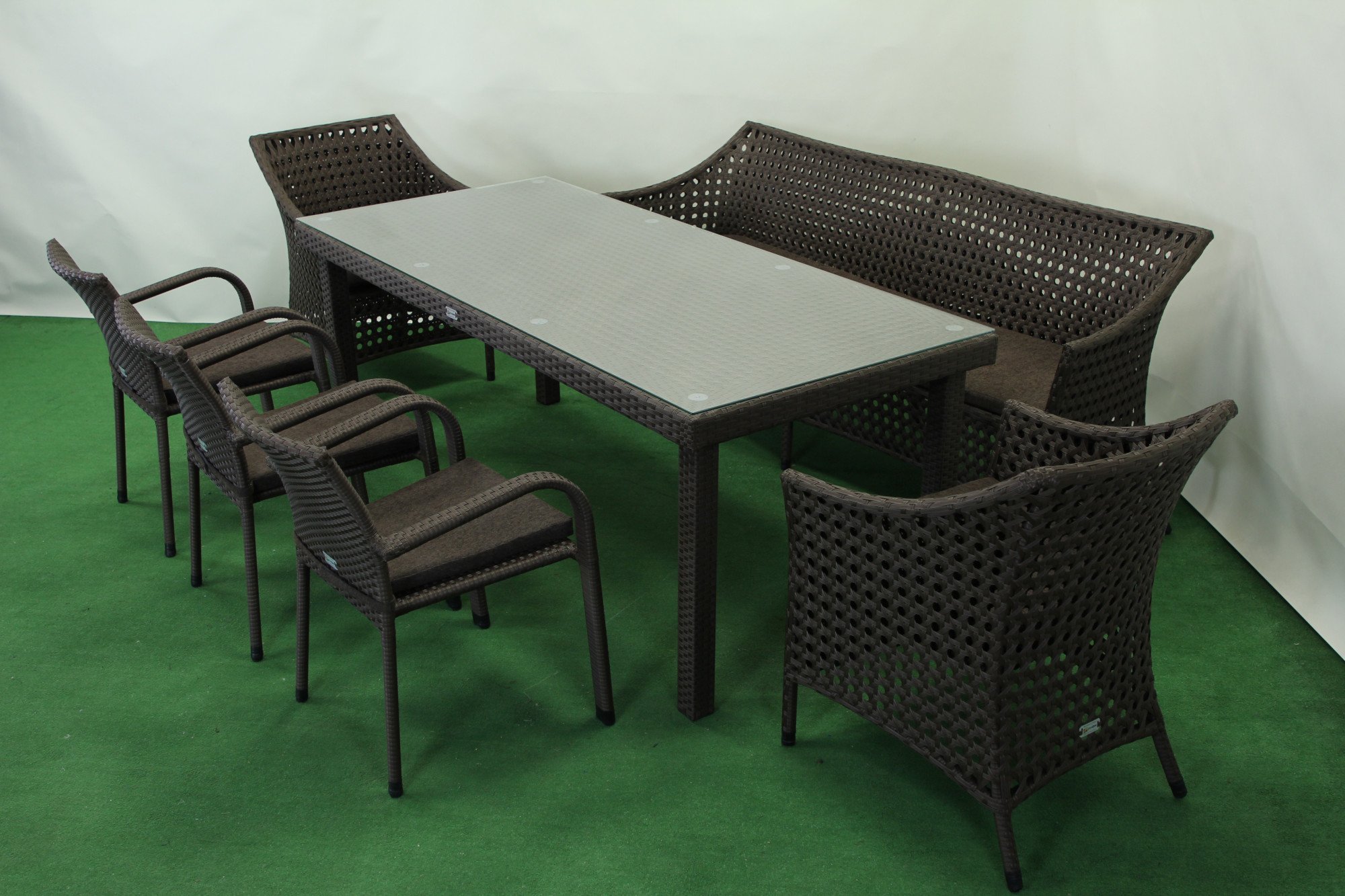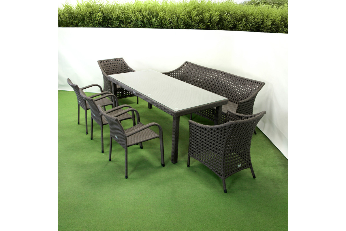 Комплект садових меблів Greengard Гармонія— стильне та практичне рішення для тераси, альтанки, саду чи зони відпочинку. Виготовлений зі штучного ротангу, він поєднує естетику натуральних матеріалів із довговічністю сучасних технологій. У набір входить великий обідній стіл, софа, два крісла та три стільці, що дозволяє комфортно розмістити велику компанію. Металевий каркас забезпечує надійність конструкцій, а плетіння зі штучного ротангу стійке до сонця, вологи та перепадів температур. За бажанням комплект можна доповнити м’якими подушками.