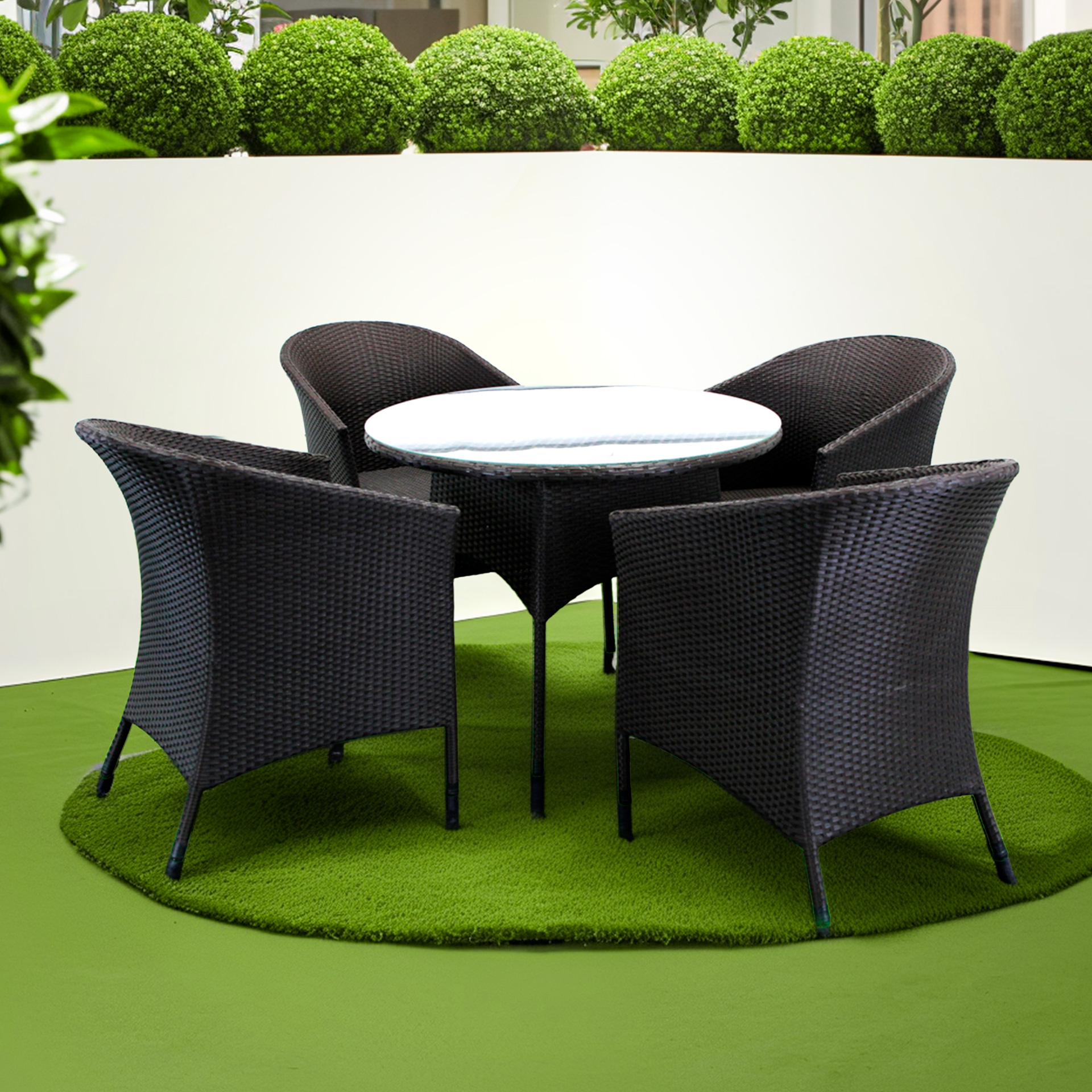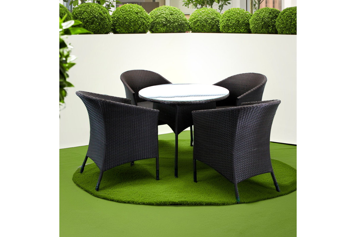 Комплект садових меблів Greengard Балеар — елегантне та практичне рішення для облаштування зони відпочинку на терасі чи у саду. Набір складається зі столу та чотирьох крісел, виконаних із штучного ротанга. Скляна стільниця додає сучасності та легкості, а міцний металевий каркас із полімерним покриттям забезпечує надійність конструкцій. Завдяки ергономічній формі крісел відпочинок стає максимально комфортним. Комплект гармонійно поєднує стильний дизайн та довговічність матеріалів. Подушки не входять до вартості комплекту.