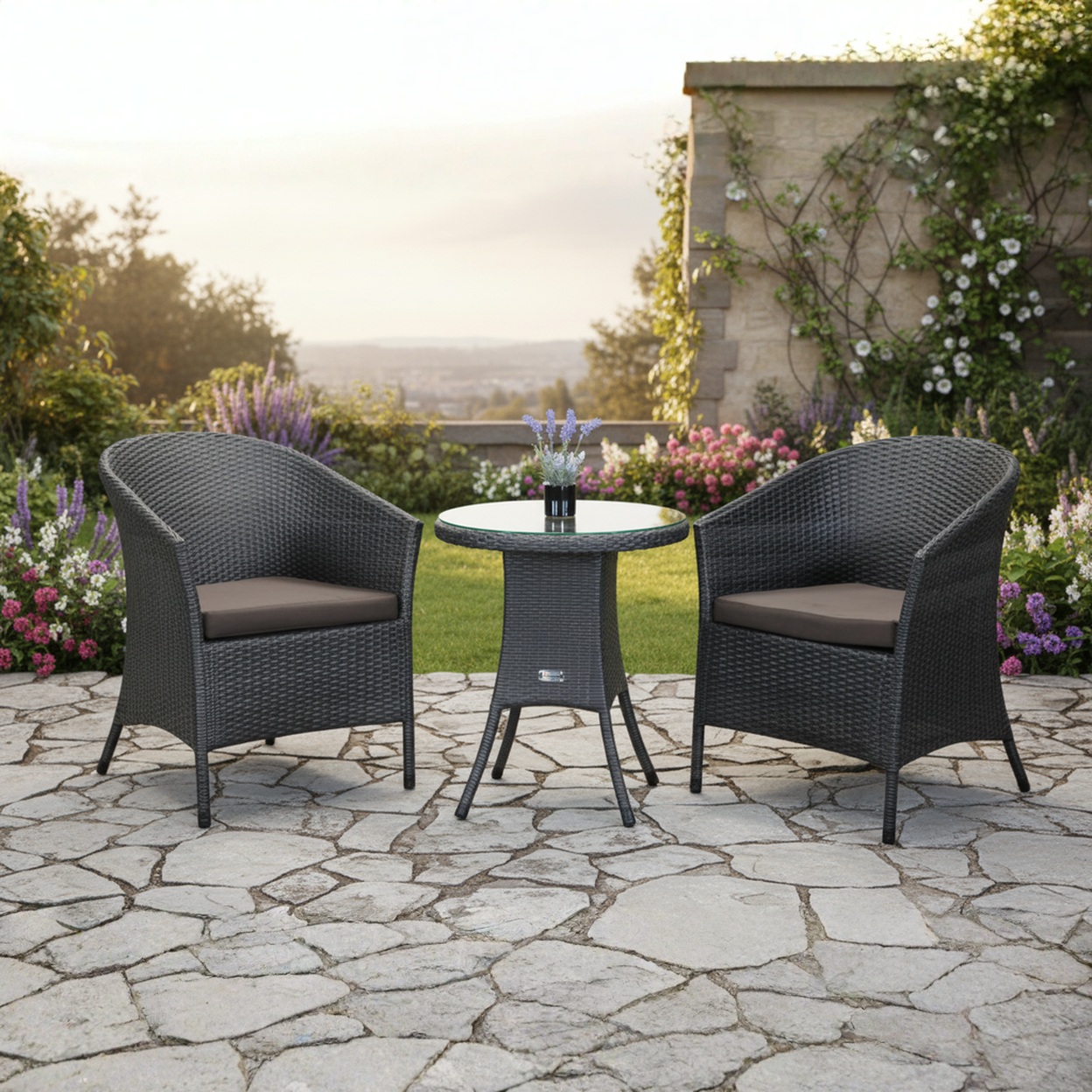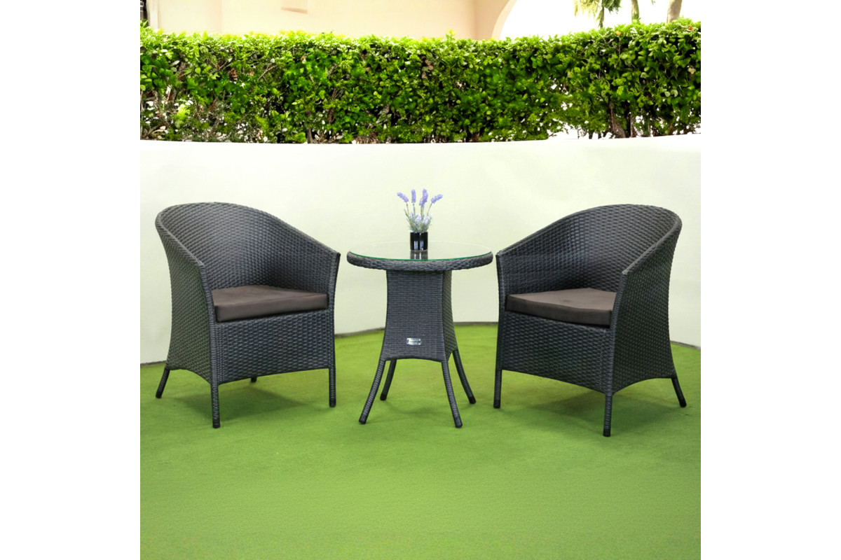 Комплект садових меблів Greengard Балеар 2— компактне та стильне рішення для облаштування затишної зони відпочинку на балконі, терасі чи в саду. Набір складається зі столу та двох крісел, виконаних із високоякісного штучного ротанга. Скляна стільниця з посиленням плівкою додає елегантності та практичності, а металевий каркас із полімерним покриттям забезпечує міцність і довговічність. Ергономічна форма крісел створює комфортні умови для відпочинку. Подушки не входять до вартості комплекту.