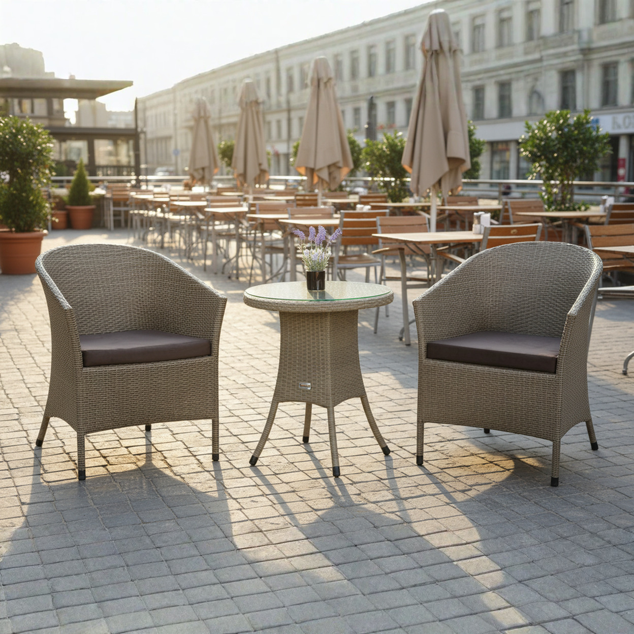 Комплект садових меблів Greengard Балеар 2— компактне та стильне рішення для облаштування затишної зони відпочинку на балконі, терасі чи в саду. Набір складається зі столу та двох крісел, виконаних із високоякісного штучного ротанга. Скляна стільниця з посиленням плівкою додає елегантності та практичності, а металевий каркас із полімерним покриттям забезпечує міцність і довговічність. Ергономічна форма крісел створює комфортні умови для відпочинку. Подушки не входять до вартості комплекту.