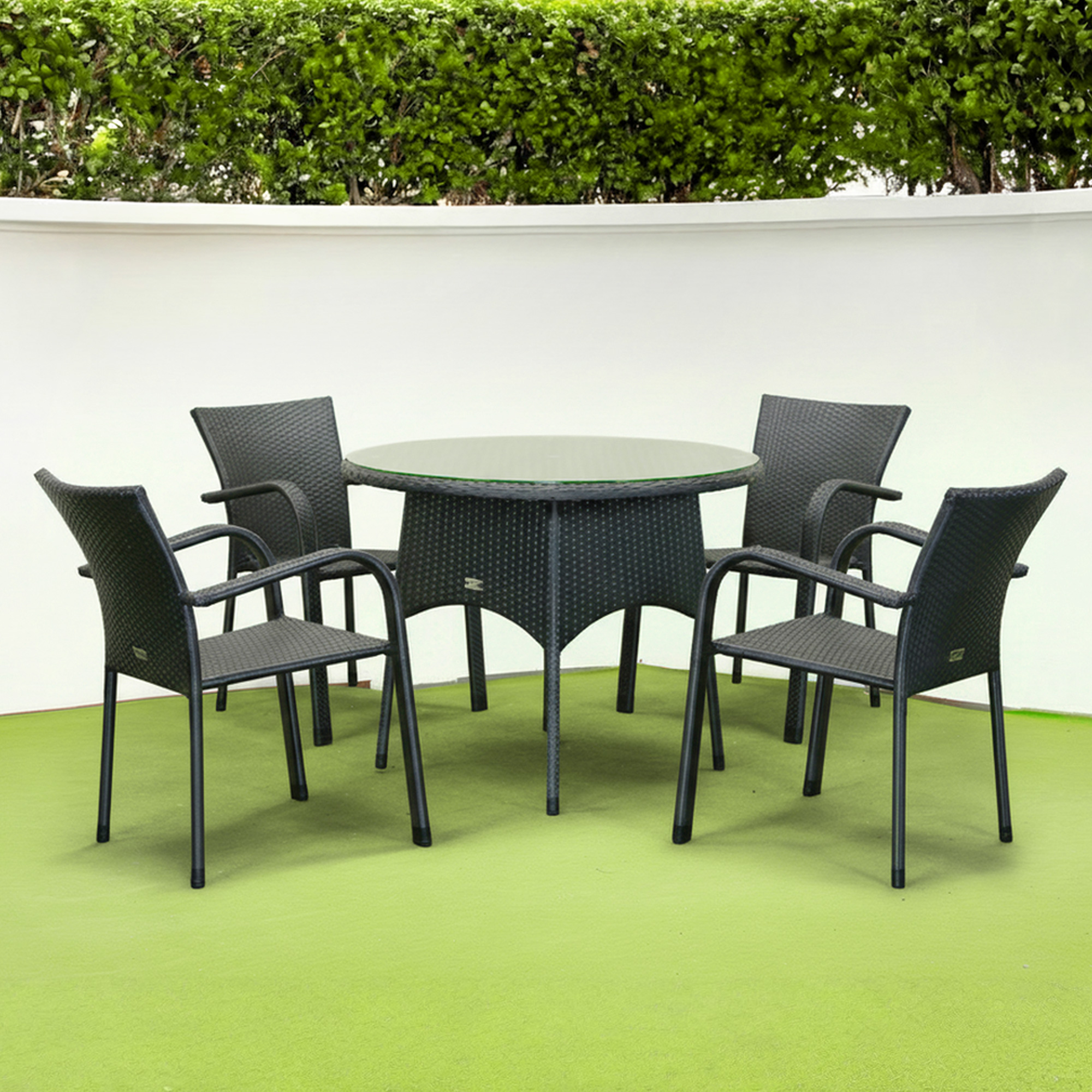 Комплект садових меблів Greengard Балеар Лайт — стильне та практичне рішення для облаштування зони відпочинку на терасі чи у саду. Набір складається зі столу та чотирьох стільців із підлокітниками, виконаних із штучного ротанга. Скляна стільниця додає сучасності та легкості, а металевий каркас із полімерним покриттям забезпечує міцність і довговічність. Ергономічна форма сидінь створює комфортні умови для відпочинку. Подушки не входять до вартості комплекту.