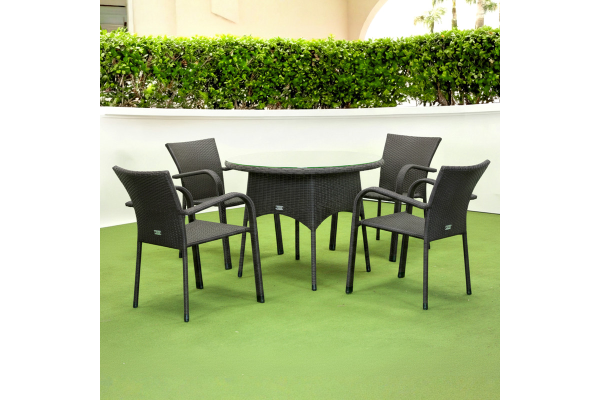 Комплект садових меблів Greengard Балеар Лайт — стильне та практичне рішення для облаштування зони відпочинку на терасі чи у саду. Набір складається зі столу та чотирьох стільців із підлокітниками, виконаних із штучного ротанга. Скляна стільниця додає сучасності та легкості, а металевий каркас із полімерним покриттям забезпечує міцність і довговічність. Ергономічна форма сидінь створює комфортні умови для відпочинку. Подушки не входять до вартості комплекту.