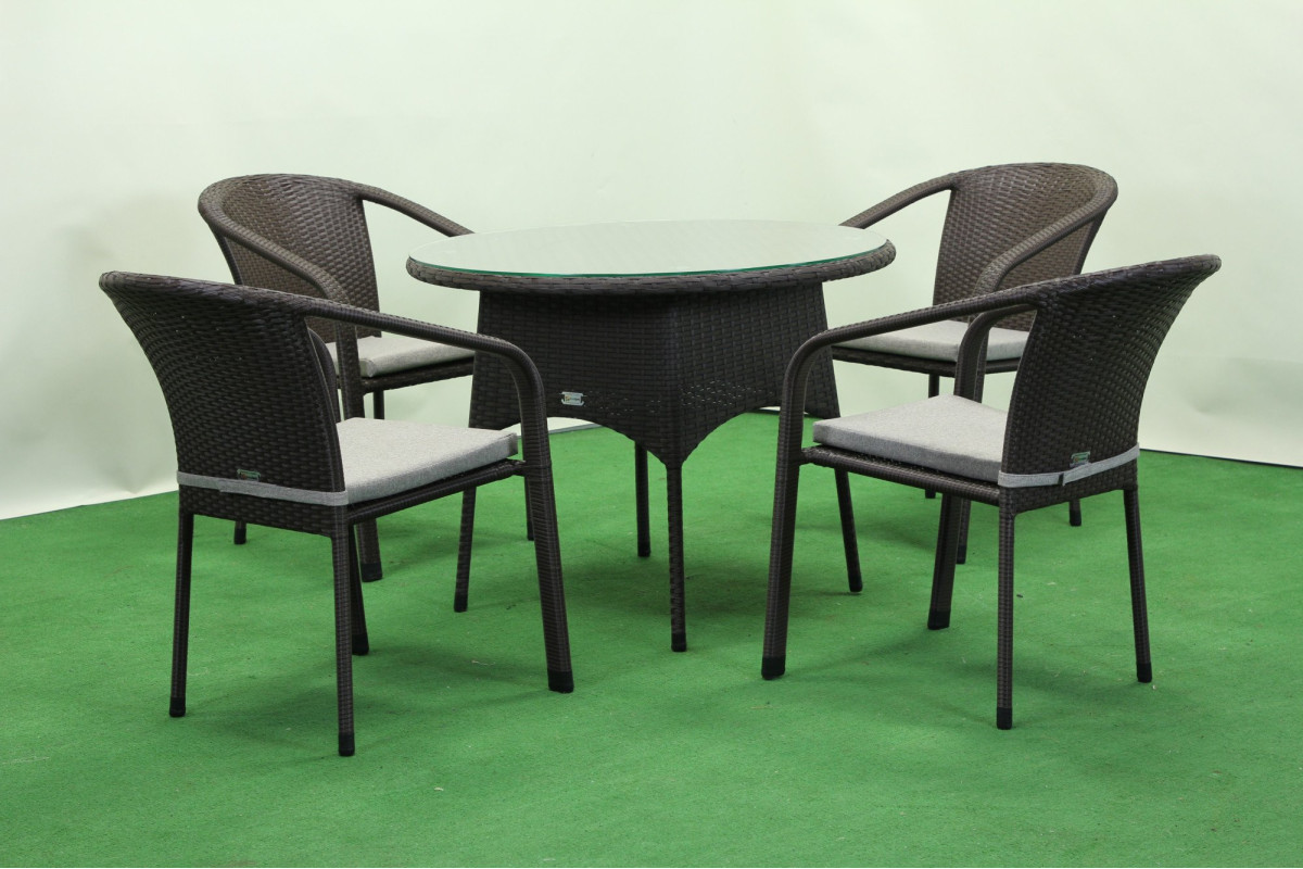 Комплект садових меблів Greengard Балеар Лайт — стильне та практичне рішення для облаштування зони відпочинку на терасі чи у саду. Набір складається зі столу та чотирьох стільців із підлокітниками, виконаних із штучного ротанга. Скляна стільниця додає сучасності та легкості, а металевий каркас із полімерним покриттям забезпечує міцність і довговічність. Ергономічна форма сидінь створює комфортні умови для відпочинку. Подушки не входять до вартості комплекту.