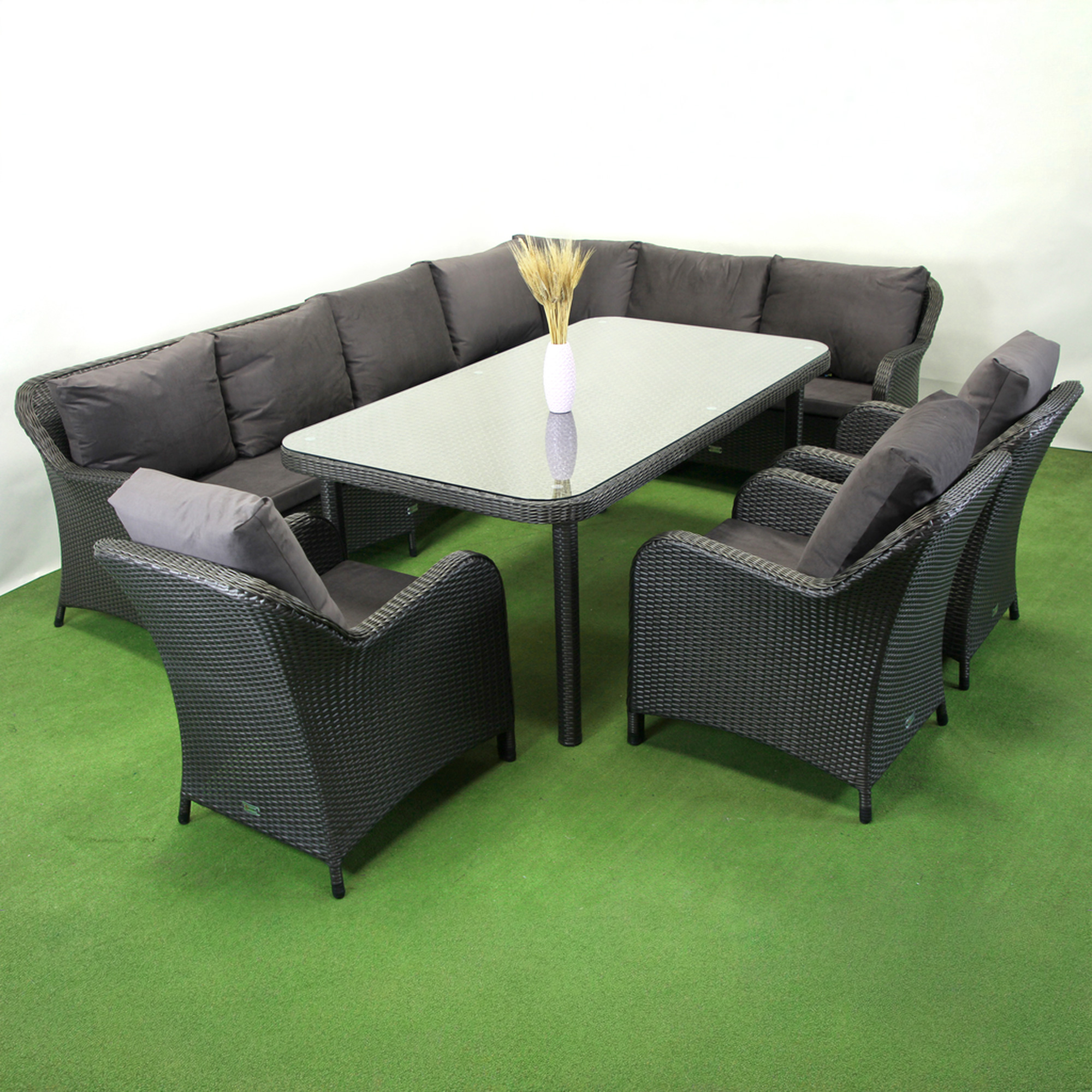 Комплект садових меблів Greengard Версаль— стильне та комфортне рішення для облаштування зони відпочинку на терасі, у саду чи на відкритому повітрі. Витончений дизайн у поєднанні з високоякісними матеріалами забезпечує естетичний вигляд та довговічність виробу. Штучний ротанг стійкий до сонця, вологи та перепадів температур, а меблевий велюр із наповнювачем поролон + холофайбер гарантує м’якість і зручність. Скляна стільниця додає елегантності та практичності, створюючи гармонійний ансамбль для відпочинку.