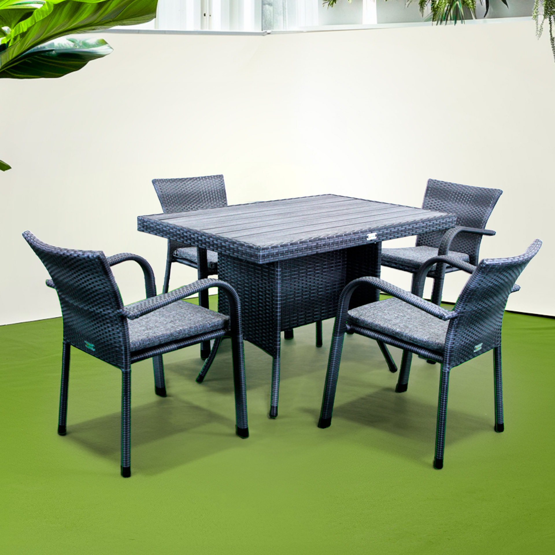 Комплект садових меблів Greengard Композит 120 — практичне рішення для облаштування зони відпочинку на терасі чи у саду. Набір складається зі столу та чотирьох стільців із підлокітниками, виконаних зі штучного ротанга. Металевий каркас із полімерним покриттям забезпечує міцність і довговічність, а ергономічна форма сидінь створює комфортні умови для відпочинку. Подушки не входять до вартості комплекту.
