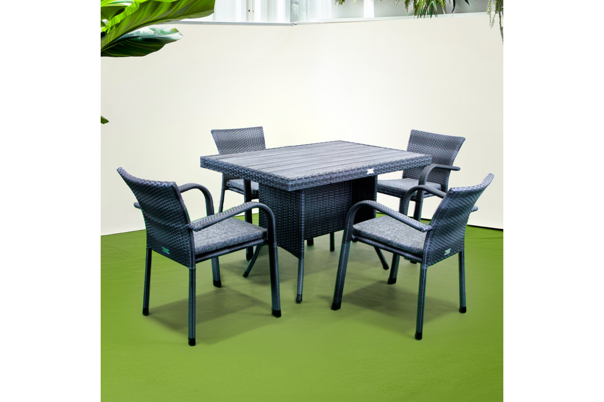 Комплект садових меблів Greengard Композит 120 — практичне рішення для облаштування зони відпочинку на терасі чи у саду. Набір складається зі столу та чотирьох стільців із підлокітниками, виконаних зі штучного ротанга. Металевий каркас із полімерним покриттям забезпечує міцність і довговічність, а ергономічна форма сидінь створює комфортні умови для відпочинку. Подушки не входять до вартості комплекту.
