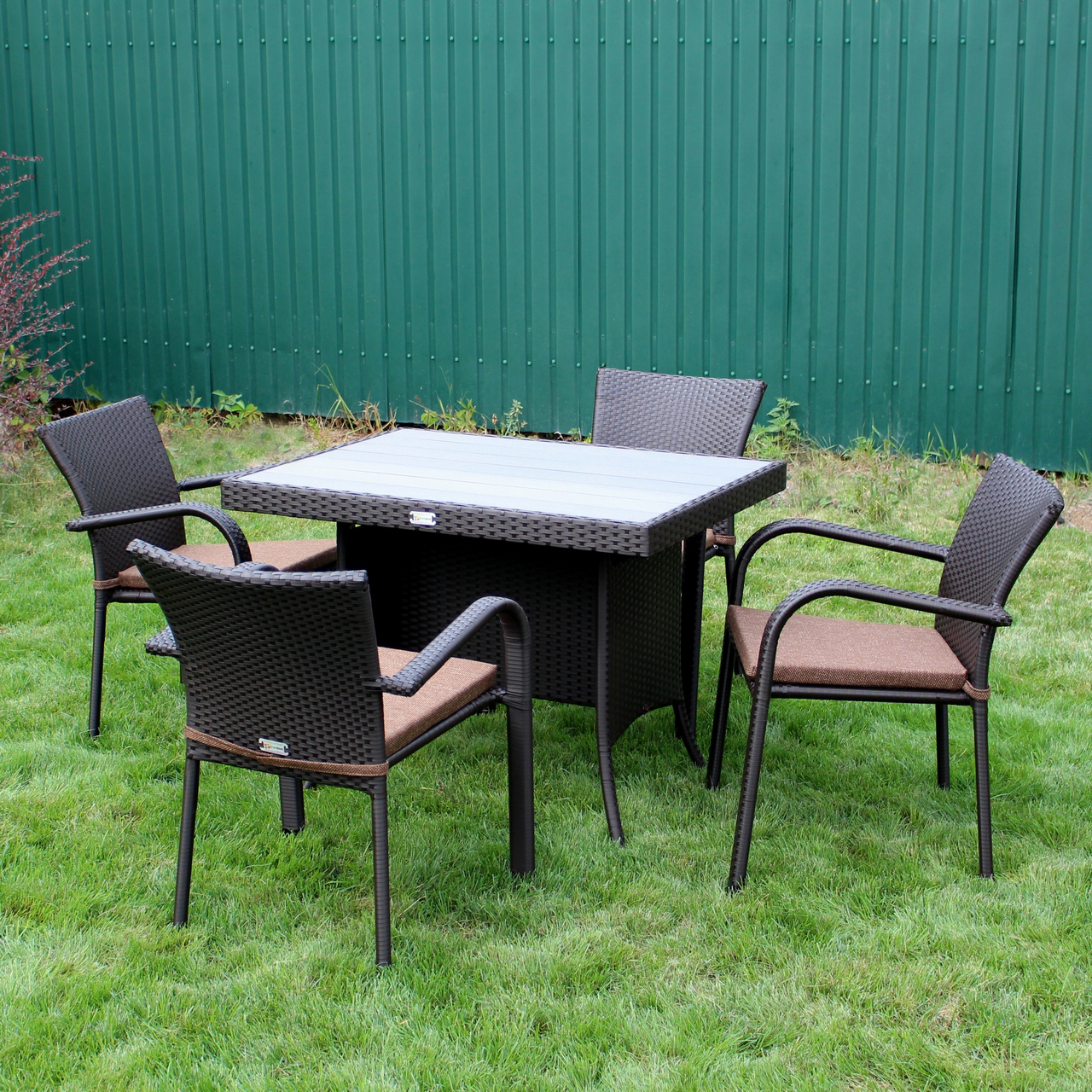 Комплект садових меблів Greengard Композит 100 — стильне та практичне рішення для облаштування зони відпочинку на терасі чи у саду. Набір складається зі столу та чотирьох стільців із підлокітниками, виконаних зі штучного ротанга. Металевий каркас із полімерним покриттям забезпечує міцність і довговічність, а ергономічна форма сидінь створює комфортні умови для відпочинку. Подушки не входять до вартості комплекту.
