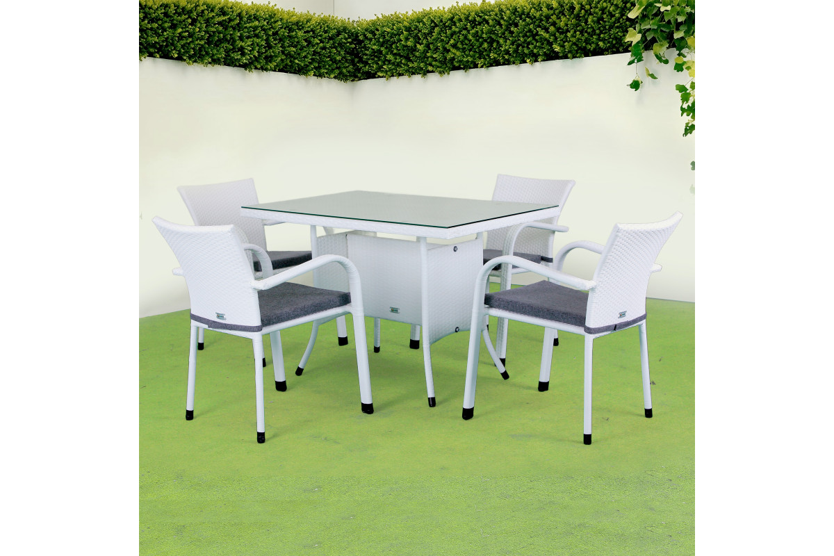 Комплект садових меблів Greengard Комфорт 100 — стильне та функціональне рішення для облаштування зони відпочинку на терасі, в альтанці чи саду. Завдяки універсальному дизайну гармонійно доповнює інтер’єр обідньої зони у квартирі або будинку. Штучний ротанг безпечний у використанні, не має запаху та не викликає алергії, а скляна стільниця, посилена німецькою плівкою d-c-fix, вирізняється міцністю та елегантним матовим відтінком. Стіл можна розібрати при необхідності, а стільці з підлокітниками забезпечують комфорт під час відпочинку. Можлива комплектація подушками.