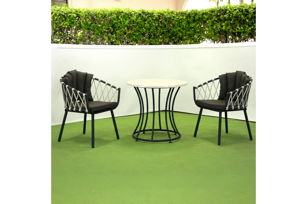 Комплект садових меблів Greengard Рів’єра — стильне та елегантне рішення для облаштування затишної зони відпочинку на терасі чи в саду. Набір складається з двох комфортних крісел із м’якими подушками та оригінальним плетінням, а також круглого столу зі стільницею з верзоліту, що імітує дерево. Завдяки металевому каркасу з порошковим фарбуванням меблі вирізняються високою стійкістю до корозії та зовнішніх впливів, зберігаючи естетичний вигляд протягом багатьох років.