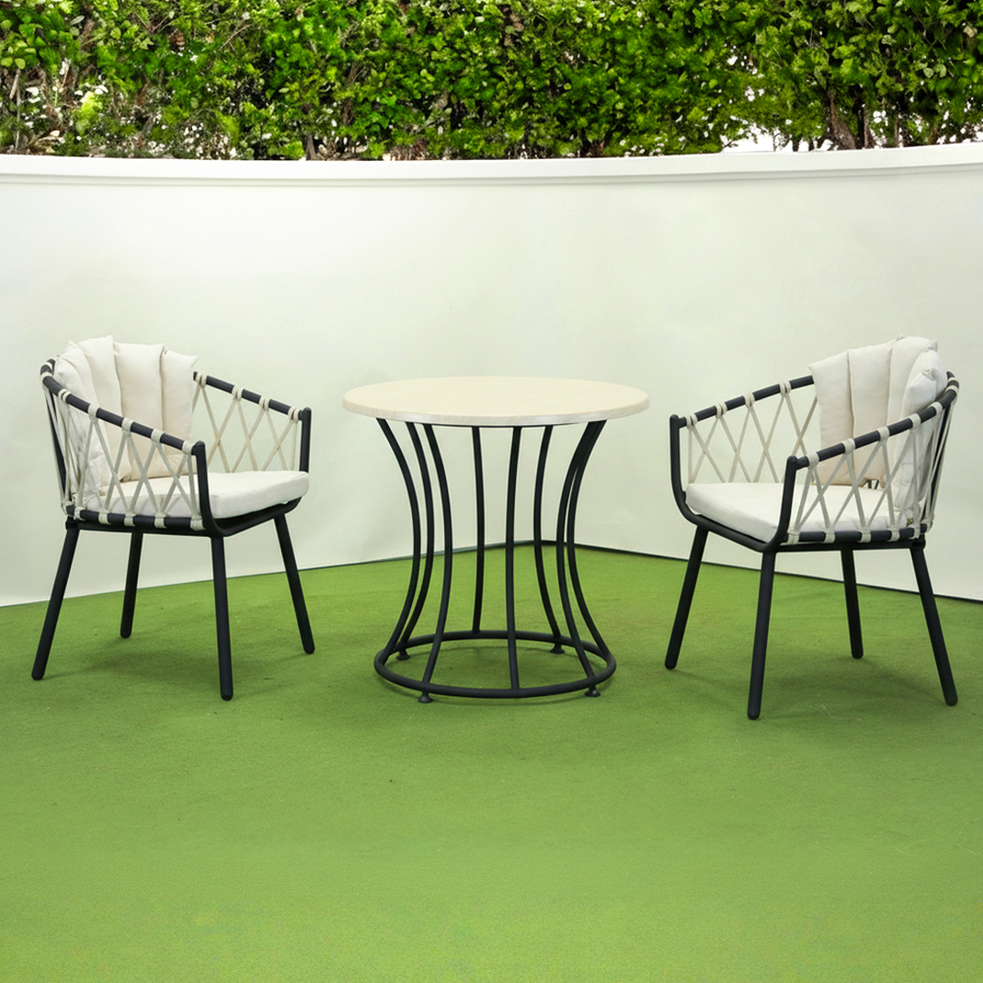 Комплект садових меблів Greengard Рів’єра — стильне та елегантне рішення для облаштування затишної зони відпочинку на терасі чи в саду. Набір складається з двох комфортних крісел із м’якими подушками та оригінальним плетінням, а також круглого столу зі стільницею з верзоліту, що імітує дерево. Завдяки металевому каркасу з порошковим фарбуванням меблі вирізняються високою стійкістю до корозії та зовнішніх впливів, зберігаючи естетичний вигляд протягом багатьох років.