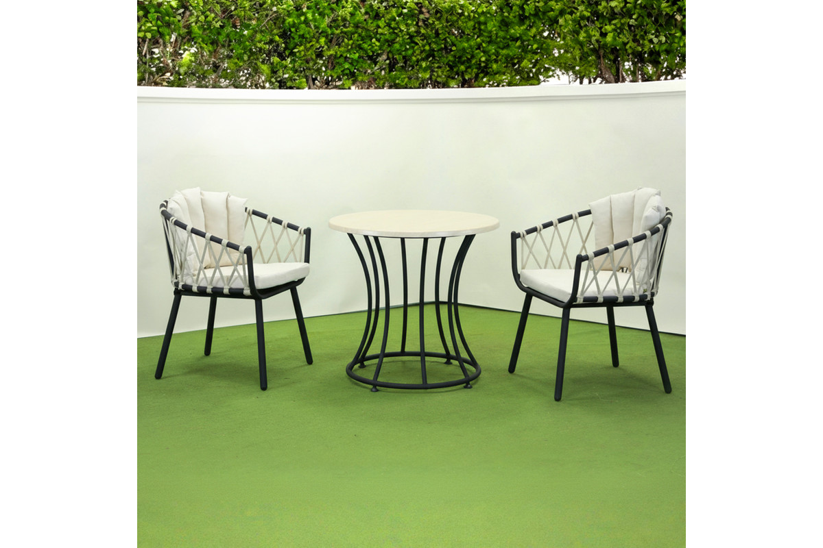 Комплект садових меблів Greengard Рів’єра — стильне та елегантне рішення для облаштування затишної зони відпочинку на терасі чи в саду. Набір складається з двох комфортних крісел із м’якими подушками та оригінальним плетінням, а також круглого столу зі стільницею з верзоліту, що імітує дерево. Завдяки металевому каркасу з порошковим фарбуванням меблі вирізняються високою стійкістю до корозії та зовнішніх впливів, зберігаючи естетичний вигляд протягом багатьох років.