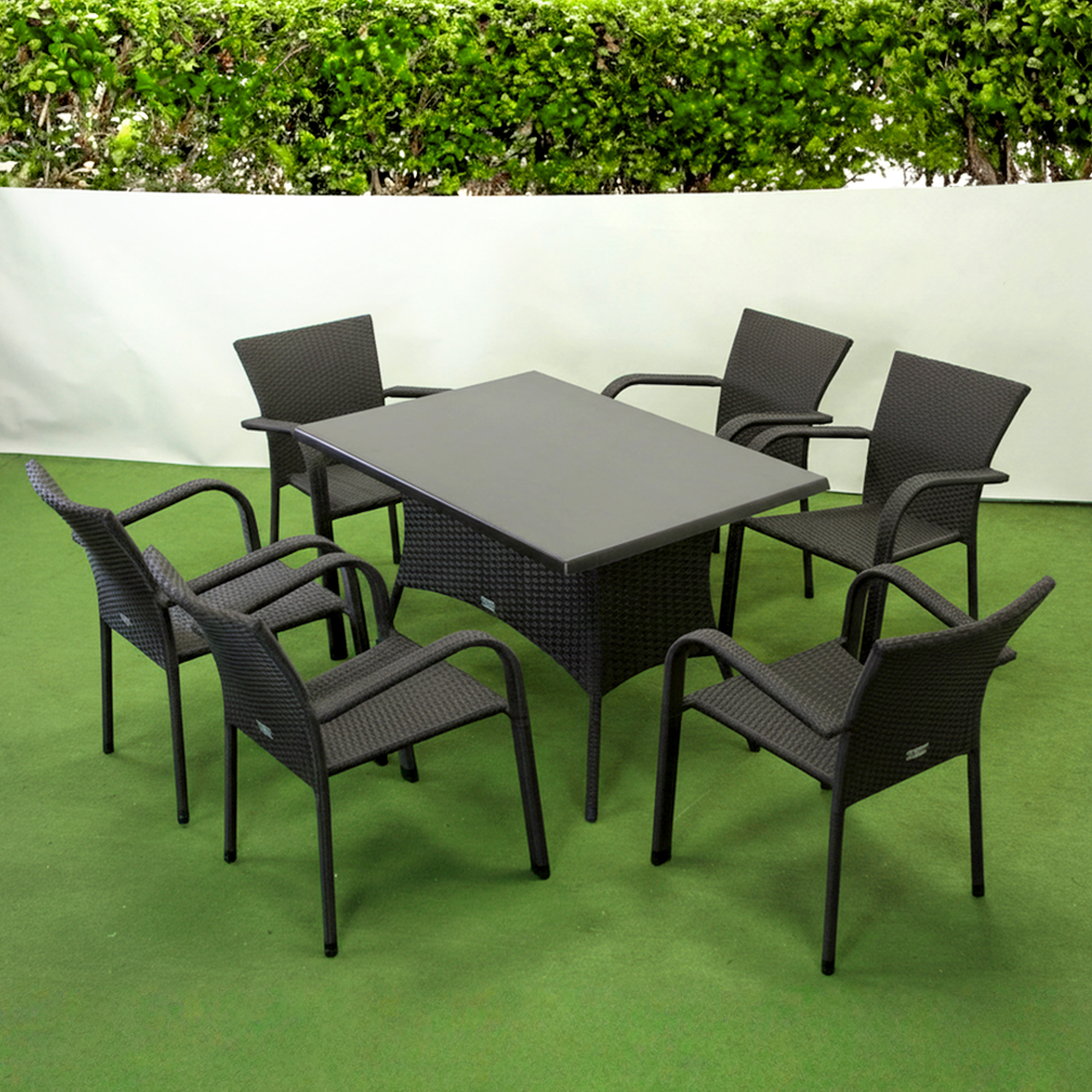 Меблі виготовлені зі штучного ротанга на металевому каркасі, що забезпечує стійкість до сонця, дощу та перепадів температур. Стільниця зі спеціального матеріалу верзоліт вирізняється міцністю та стійкістю до вологи, а зручні стільці з підлокітниками додають комфорту. Елегантний темно-коричневий колір гармонійно доповнить будь-який екстер’єр. Можлива комплектація подушками.
