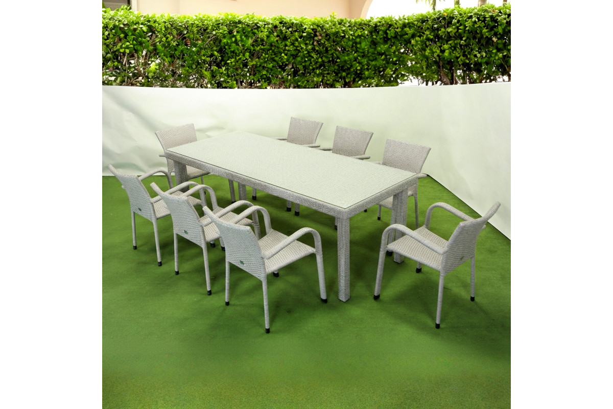 Комплект садових меблів Greengard Вермонт 220 — просторе та стильне рішення для облаштування зони відпочинку. Сучасний дизайн поєднує комфорт і функціональність, створюючи затишну атмосферу для великих компаній та сімейних обідів. Міцний металевий каркас із полімерним покриттям забезпечує надійність конструкції, а плетіння зі штучного ротанга вирізняється стійкістю до зовнішніх впливів та легкістю у догляді. Скляна стільниця додає елегантності та сучасного вигляду.