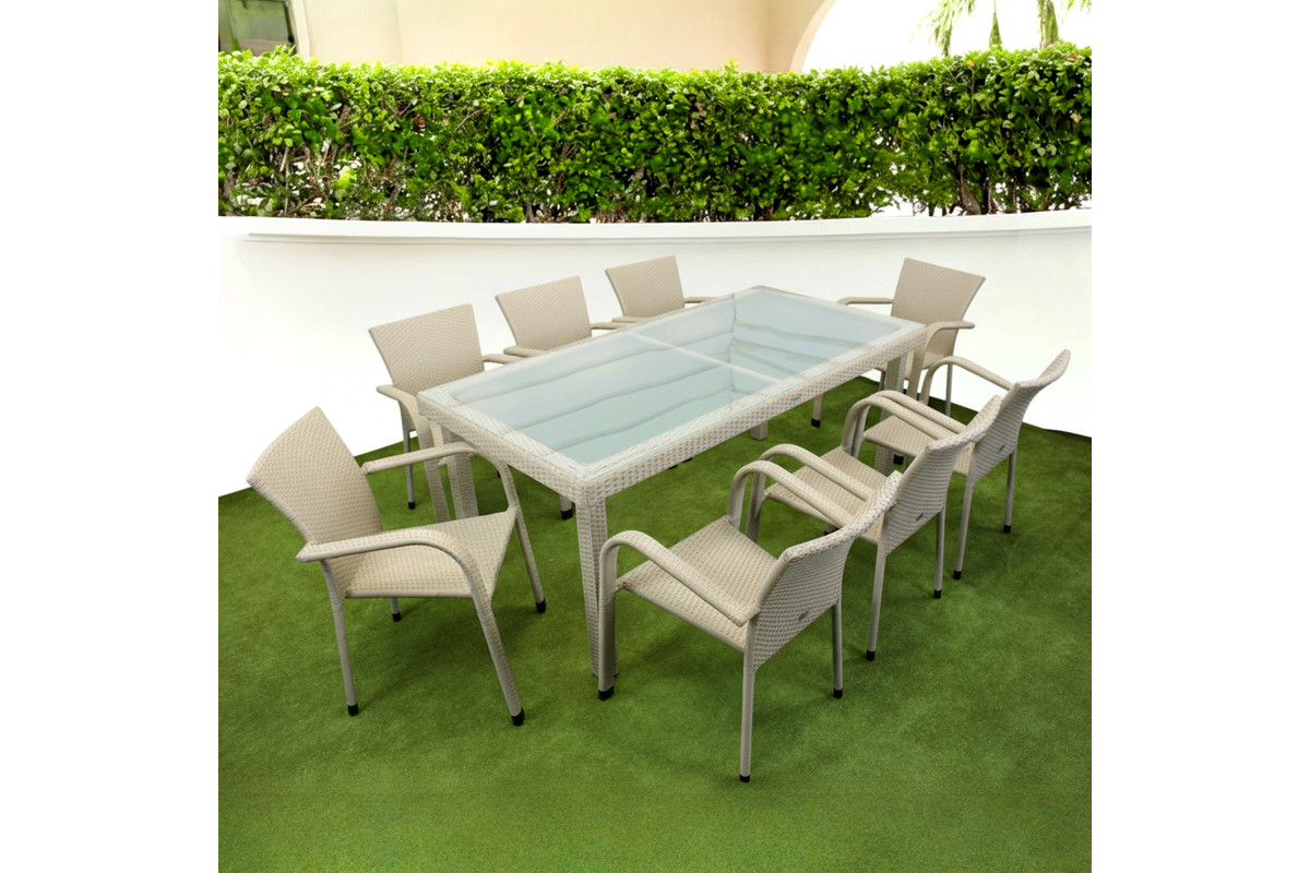 Комплект садових меблів Greengard Вермонт 180— елегантне та практичне рішення для облаштування зони відпочинку. Сучасний дизайн поєднує комфорт і функціональність, створюючи затишну атмосферу для сімейних обідів чи зустрічей на терасі, в альтанці або саду. Міцний металевий каркас із полімерним покриттям забезпечує надійність конструкції, а плетіння зі штучного ротанга вирізняється стійкістю до зовнішніх впливів та легкістю у догляді. Скляна стільниця додає комплекту витонченості та сучасного вигляду.