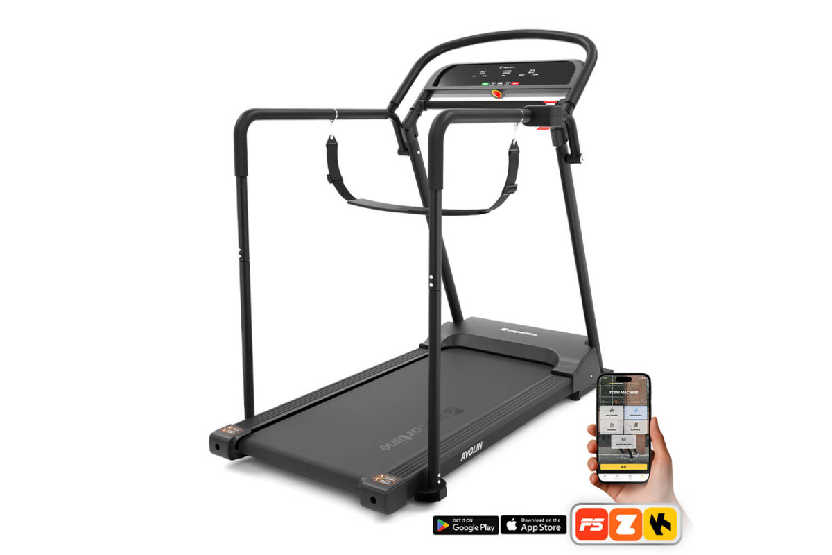 inSPORTline Avolin оснащений подвійним запобіжним пристроєм – класичним магнітним гальмом для користувача та аварійною кнопкою, розташованою з зовнішньої сторони поручнів, яка дозволяє супроводжуючій особі негайно зупинити стрічку. До комплекту також входять ремені безпеки, які допомагають підтримувати стабільність під час руху та надають тренуванню більшої впевненості. Міцний каркас і довгі поручні з боків забезпечують безпечне і контрольоване тренування на будь-якій швидкості.