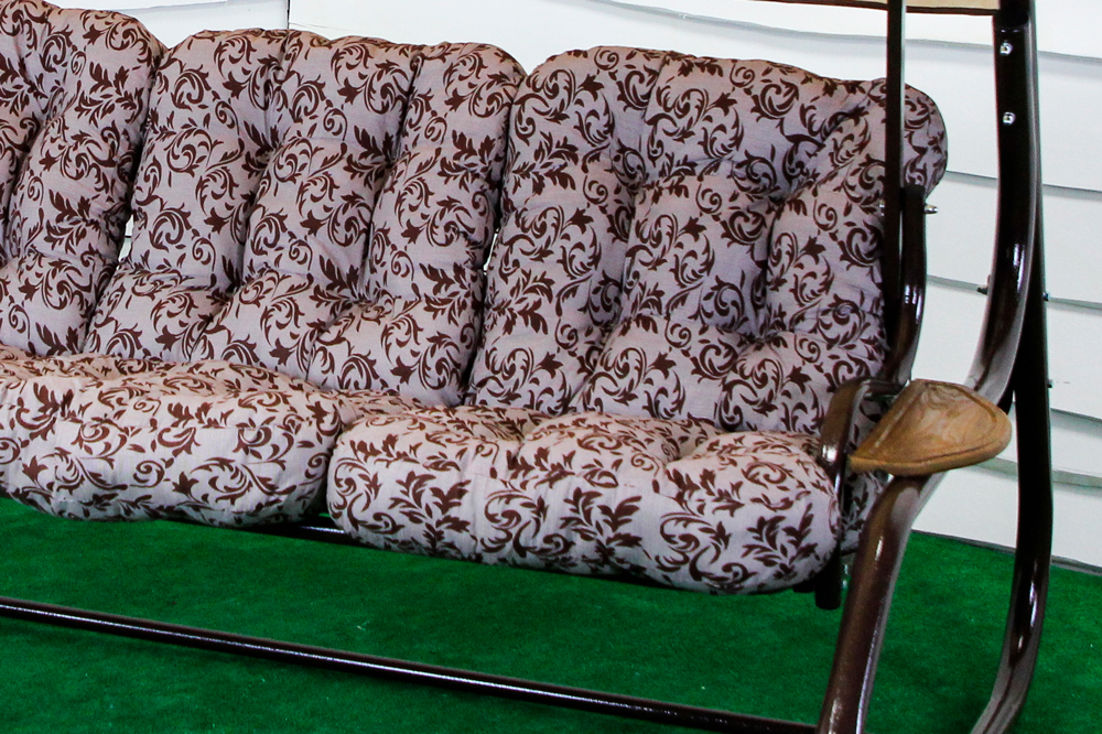 М’які подушки з чохлами із бязі GOLD у вишуканому відтінку «коричневі вензелі» додають елегантності та затишку. Наповнення із синтепону робить сидіння комфортним навіть під час тривалого відпочинку. У розкладеному вигляді гойдалка перетворюється на зручне місце для релаксу.