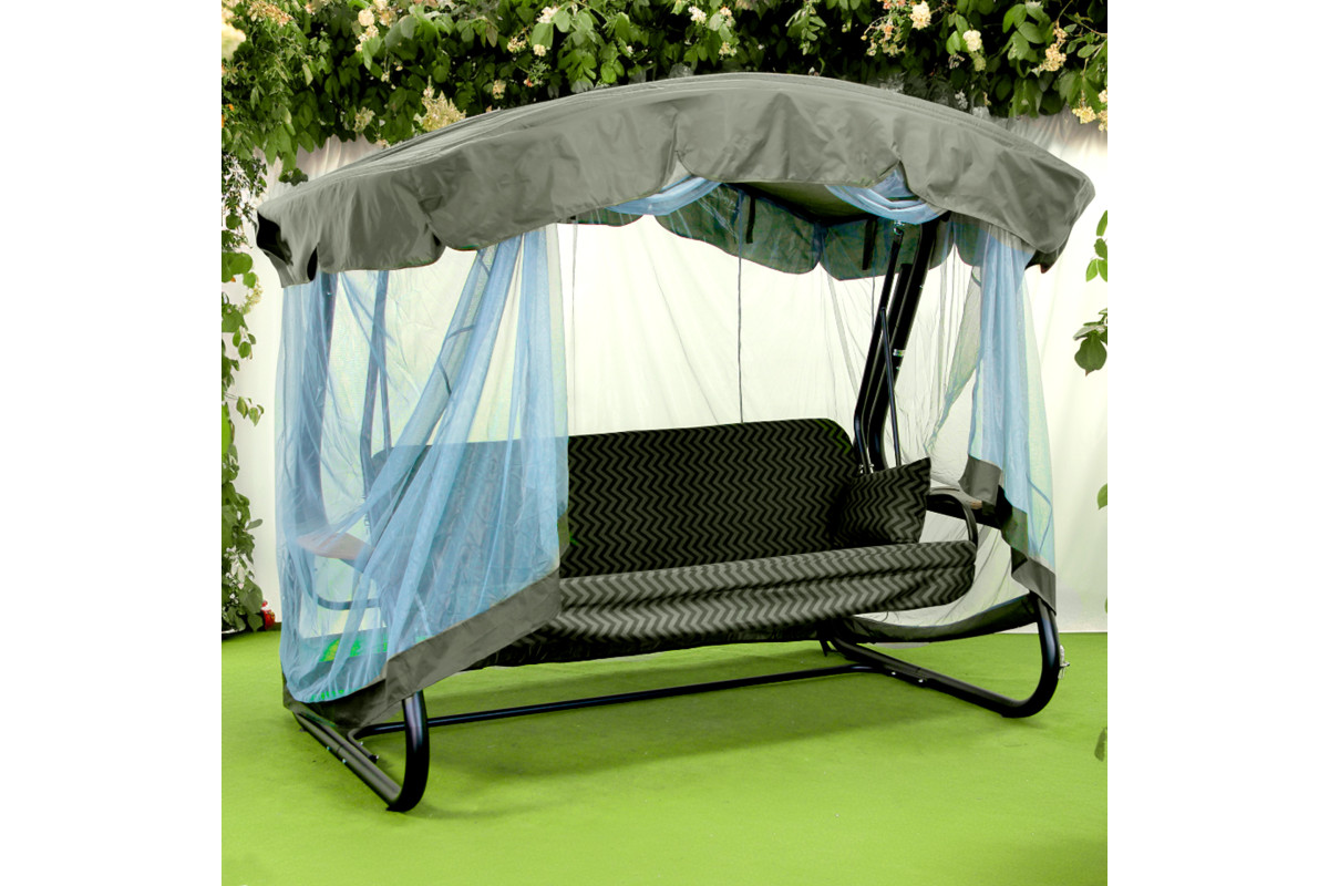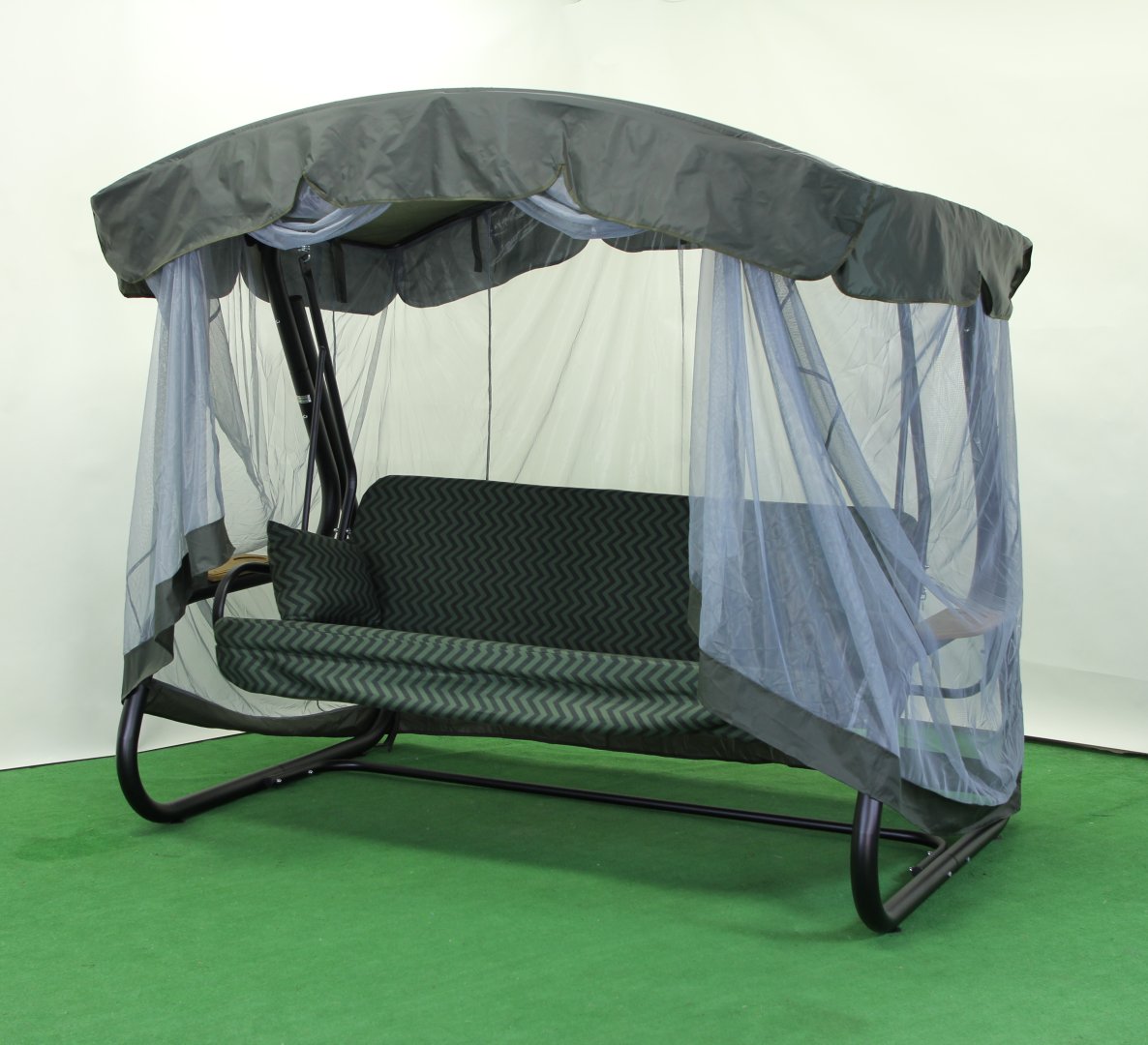 У стандартній комплектації передбачено тент і москітну сітку, яка закриває всю площу каркаса, забезпечуючи захист від сонця та комах. М’яка частина виконана з щільної тканини, верхня і нижня частини якої зшиті між собою, що запобігає сповзанню під час розгойдування. Цілісний матрац із поролоновим наповнювачем гарантує комфорт, а знімні чохли з меблевого велюру зберігають яскравість кольорів і спрощують догляд. У комплект також входять дерев’яні полиці та декоративні подушки.