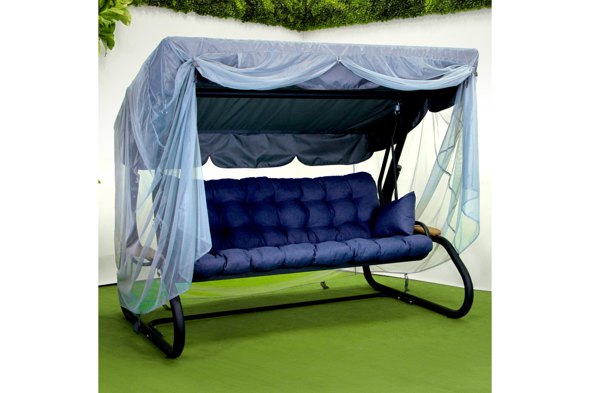 Подушки з рогожки насиченого синього кольору наповнені холлофайбером, що робить їх м’якими, пружними та стійкими до деформацій. Сірий тент із водовідштовхувальної тканини Oxford надійно захищає від сонця та легкого дощу, а антимоскітна сітка створює комфортний простір без комах. Вага виробу становить 85 кг, а для зручного транспортування передбачена компактна упаковка розміром 202 см × 82 см × 28 см. Гойдалка стане стильним акцентом саду, тераси чи зони біля басейну, даруючи атмосферу затишку для сімейних вечорів, романтичного відпочинку або читання на свіжому повітрі.