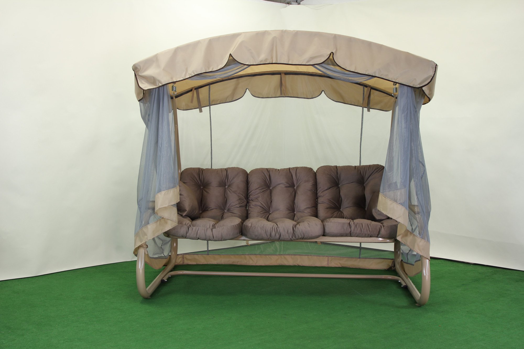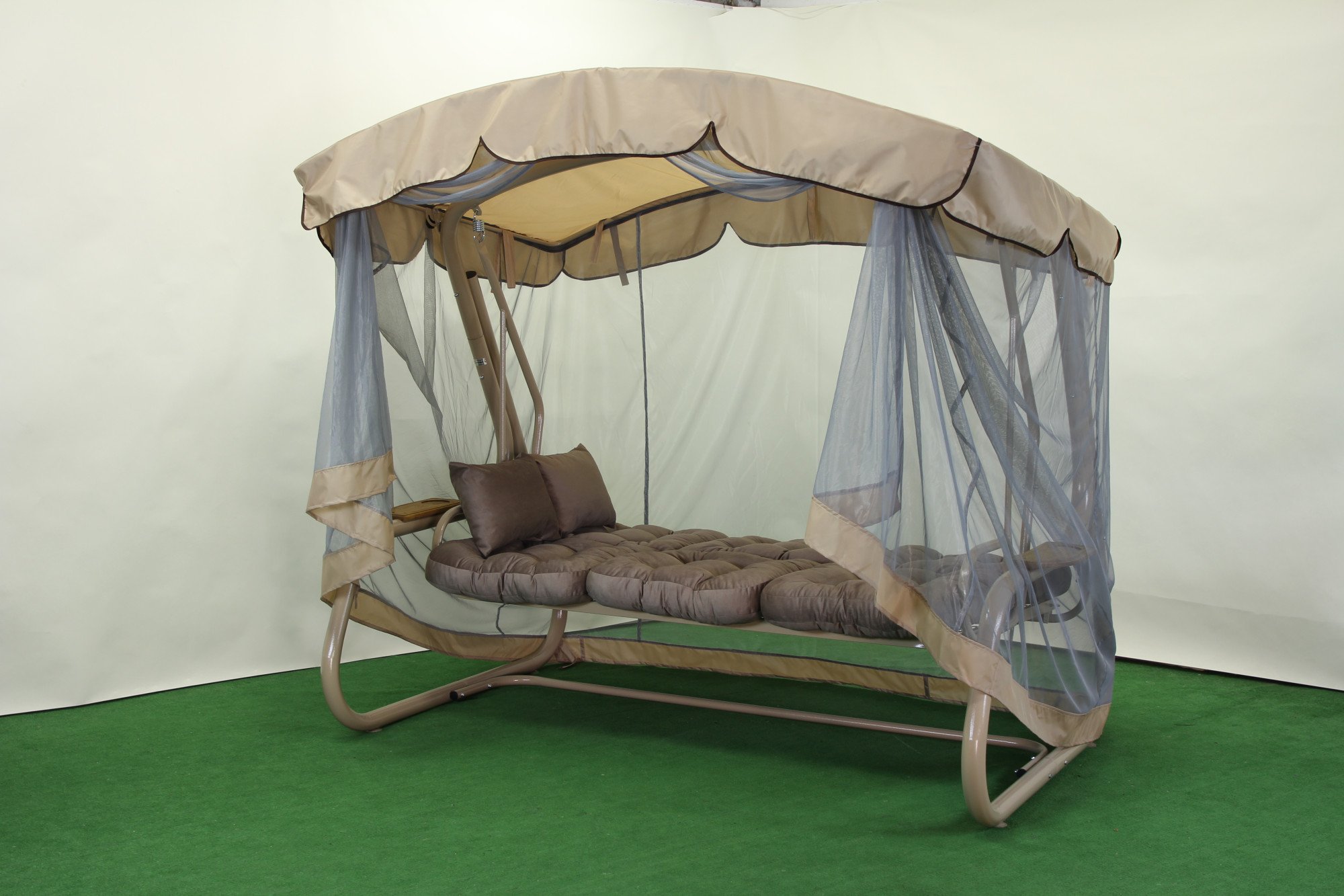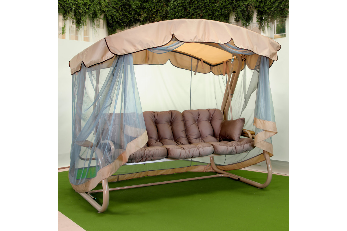 Гойдалку можна використовувати як у стандартному режимі, так і як комфортне літнє ліжко: спинка легко опускається в горизонтальне положення та фіксується від розгойдування. Москітна сітка, що входить до комплекту, повністю закриває каркас і забезпечує захист від комах, а тент створює тінь і захищає від сонця та дощу. За потреби сітку можна підв’язати під козирком або повністю відстебнути.