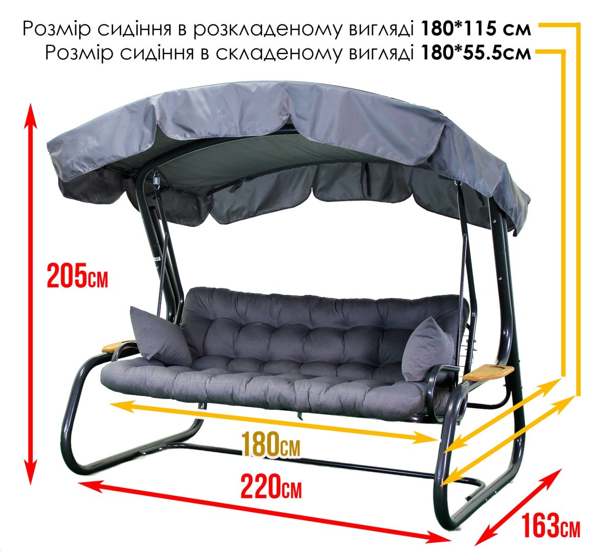 - Габарити в зібраному вигляді: 220 см × 163 см × 205 см