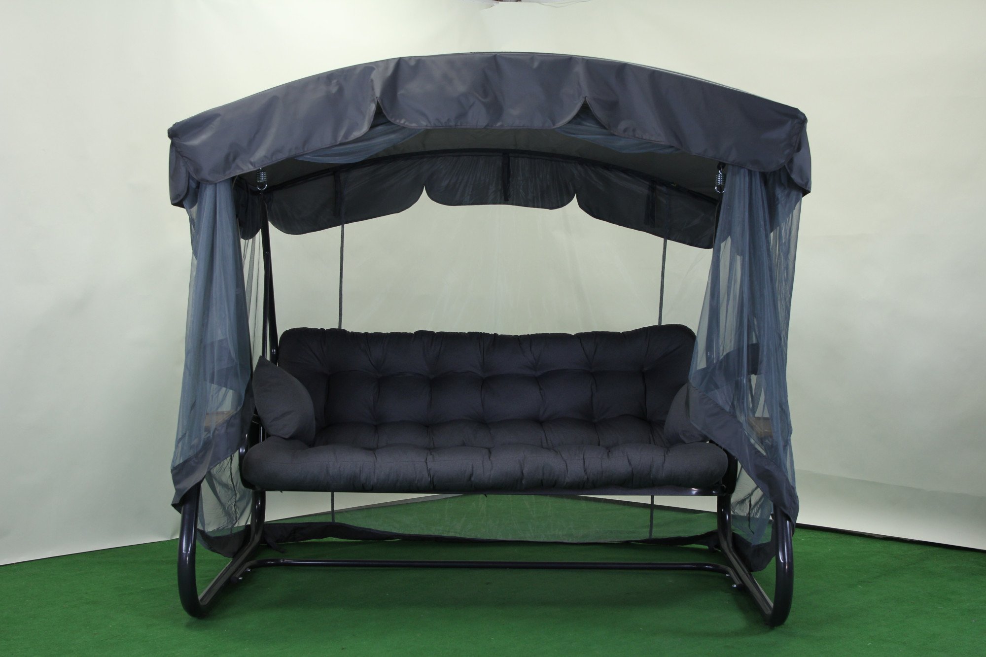 Гойдалка розрахована на велику родину: міцна конструкція витримує навантаження до 400 кг, а на сидінні комфортно розміщуються чотири дорослих. Спинка регулюється та може повністю розкладатися, перетворюючи гойдалку на зручне літнє ліжко з можливістю фіксації від розгойдування.У стандартну комплектацію входять тент і москітна сітка, що повністю закриває каркас і забезпечує комфортний відпочинок без комах. Сітку можна підв’язати під козирком або повністю відстебнути.