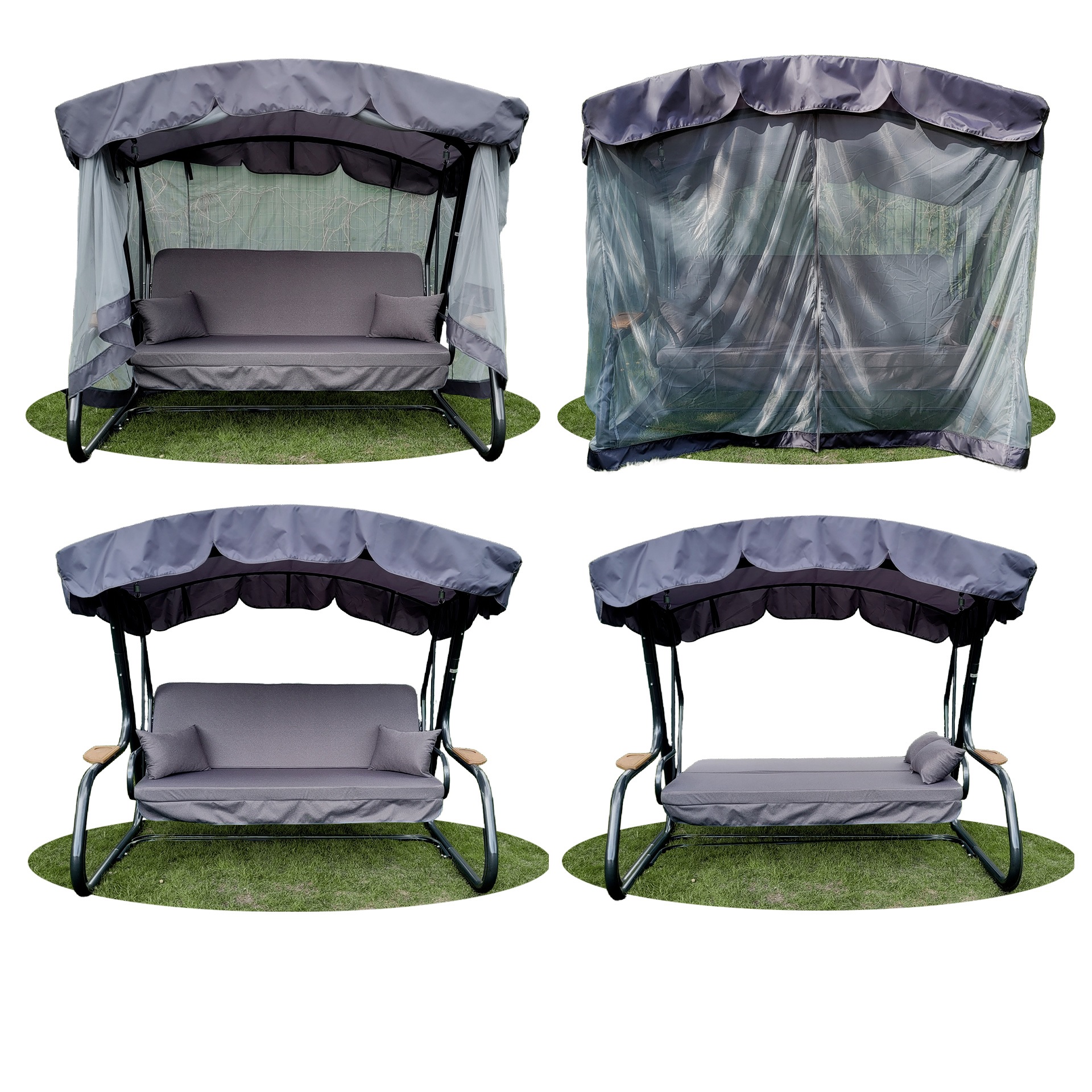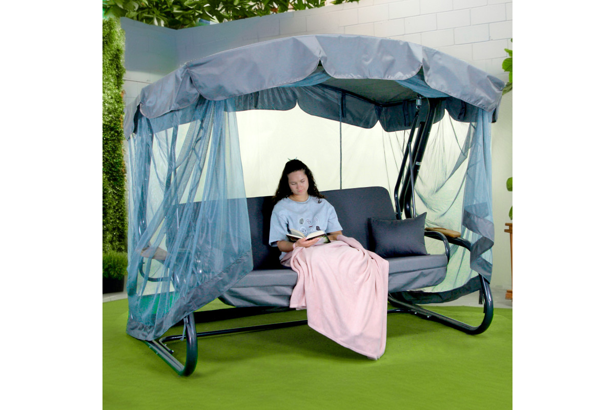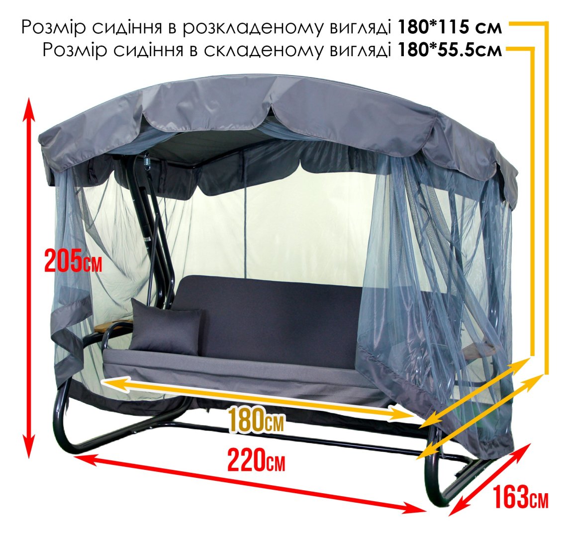 Гойдалка підходить для великої родини: міцна конструкція витримує навантаження до 400 кг, а на сидінні комфортно розміщуються чотири дорослих. Спинка регулюється та може повністю розкладатися, перетворюючи гойдалку на зручне літнє ліжко з можливістю фіксації від розгойдування. У стандартну комплектацію входять тент і москітна сітка, що повністю закриває каркас і забезпечує комфортний відпочинок без комах. Сітку можна підв’язати під козирком або повністю відстебнути.