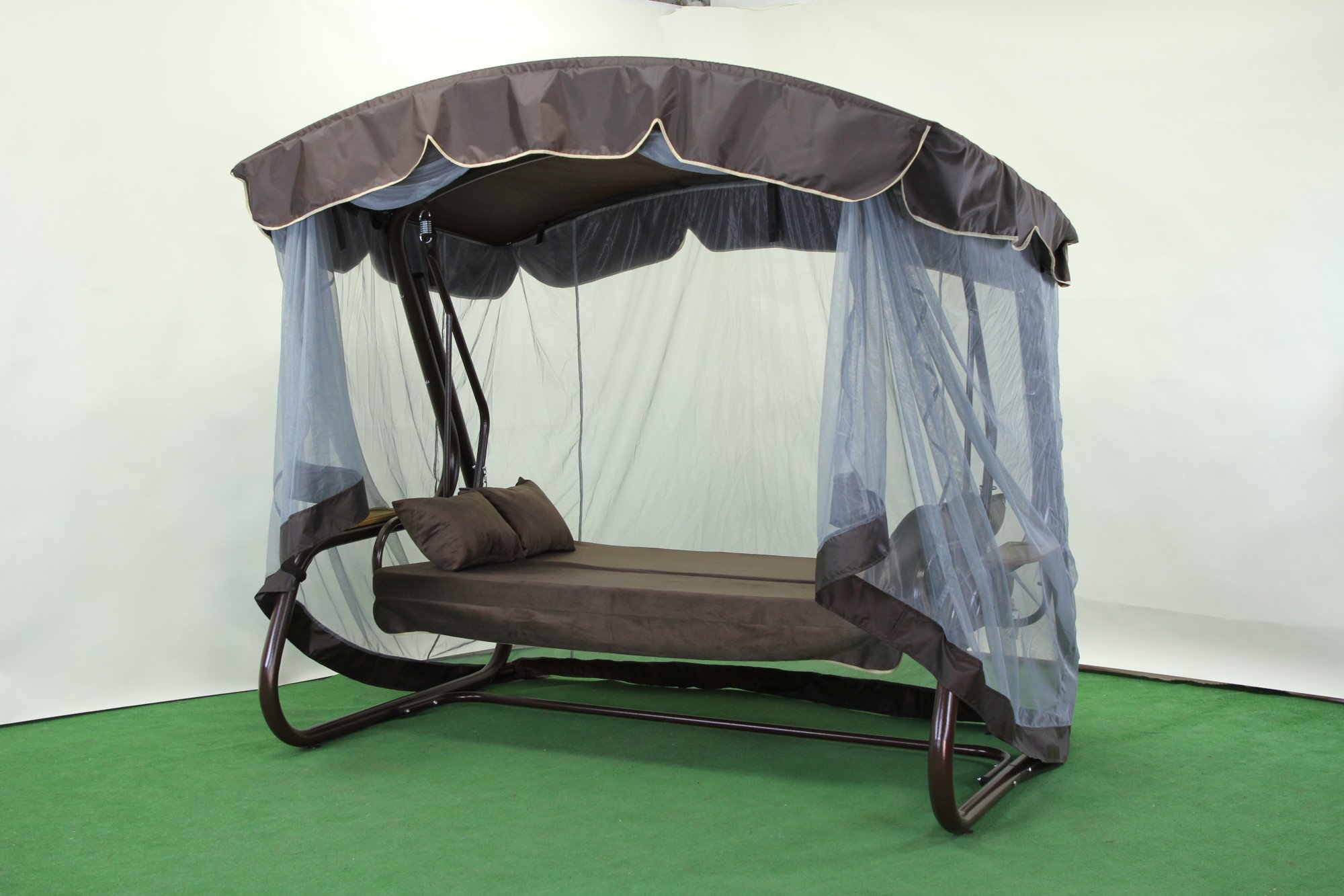 Спинка регулюється за нахилом і може повністю розкладатися у горизонтальне положення, перетворюючи гойдалку на просторе літнє ліжко з фіксацією від розгойдування. У стандартній комплектації передбачено тент і москітну сітку, що закриває каркас по всій площі та забезпечує захист від сонця, дощу й комах. За потреби сітку можна підв’язати під козирком або відстебнути.