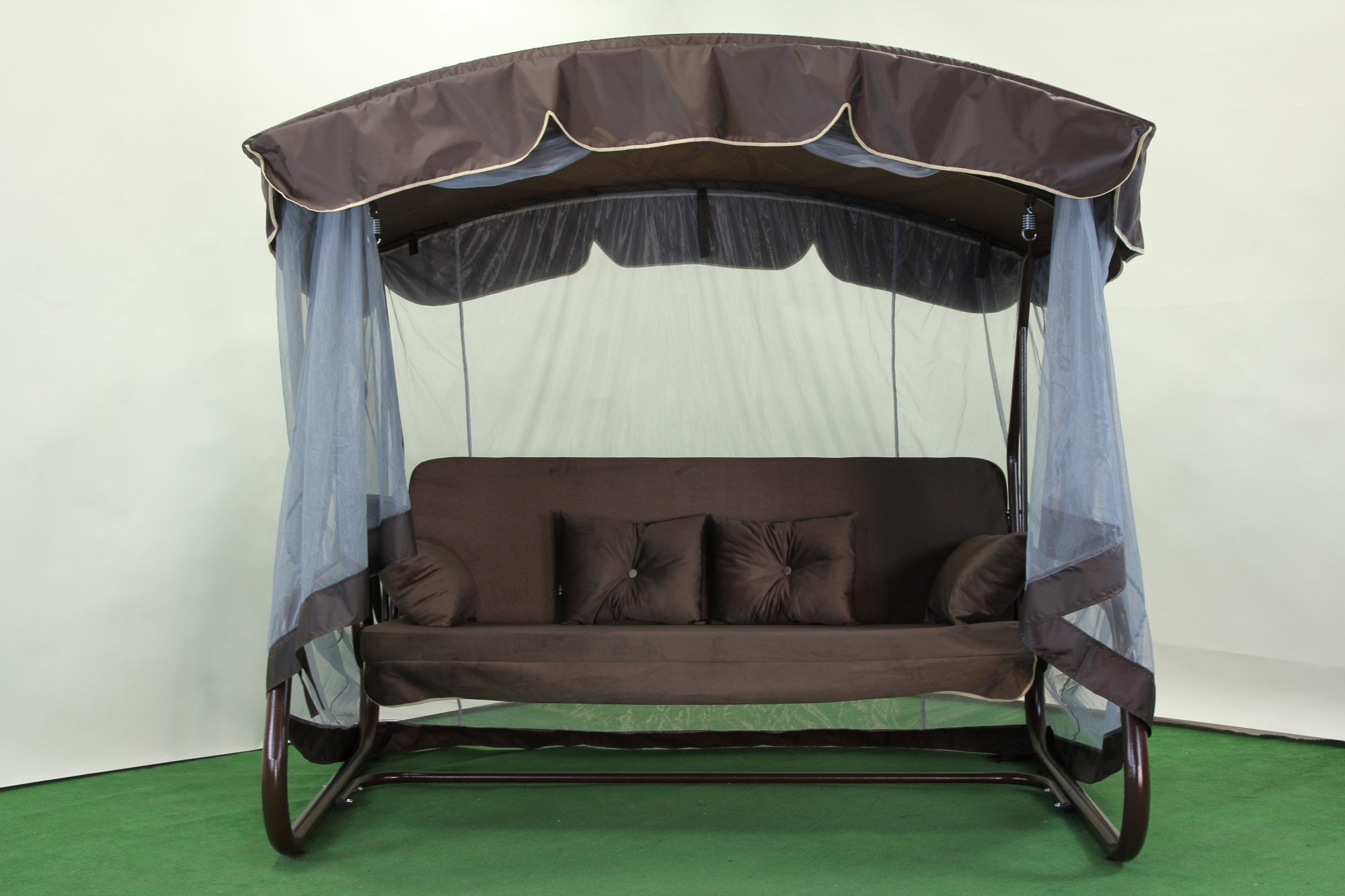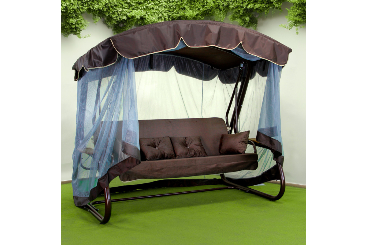 Спинка регулюється за нахилом і може повністю розкладатися у горизонтальне положення, перетворюючи гойдалку на просторе літнє ліжко з фіксацією від розгойдування. У стандартній комплектації передбачено тент і москітну сітку, що закриває каркас по всій площі та забезпечує захист від сонця, дощу й комах. За потреби сітку можна підв’язати під козирком або відстебнути.