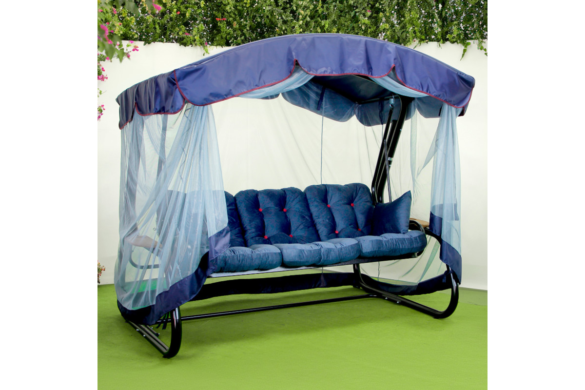 У спекотні дні тент забезпечує захист від сонця, а москітна сітка огортає каркас по всій площі, захищаючи від комах. За потреби сітку можна відстебнути або підв’язати під козирком. Спинка регулюється за нахилом і може повністю розкладатися у горизонтальне положення, перетворюючи гойдалку на просторе літнє ліжко з фіксацією від розгойдування.