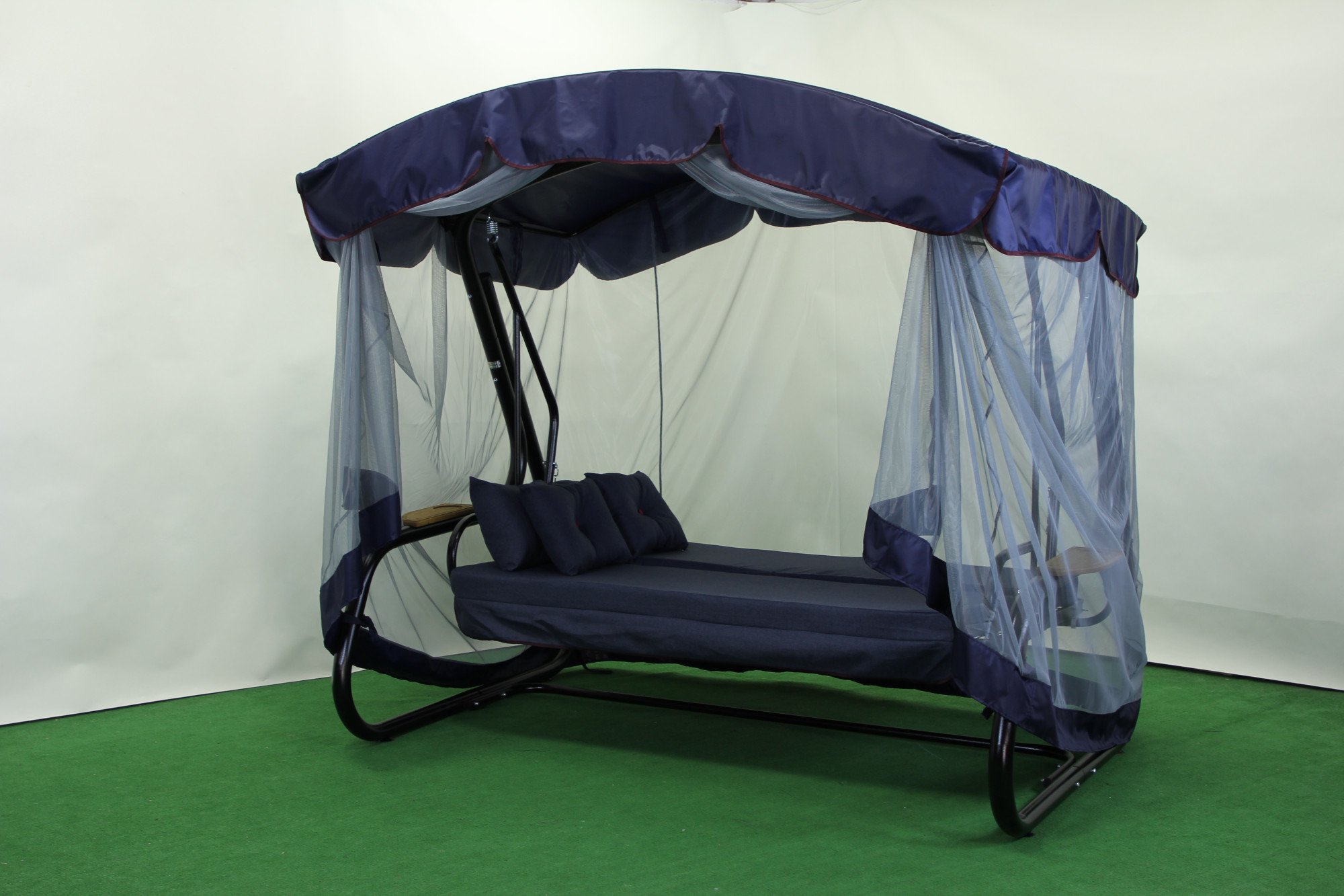 У спекотні дні тент забезпечує захист від сонця, а москітна сітка огортає каркас по всій площі, захищаючи від комах. За потреби сітку можна відстебнути або підв’язати під козирком. Спинка регулюється за нахилом і може повністю розкладатися у горизонтальне положення, перетворюючи гойдалку на просторе літнє ліжко з фіксацією від розгойдування.