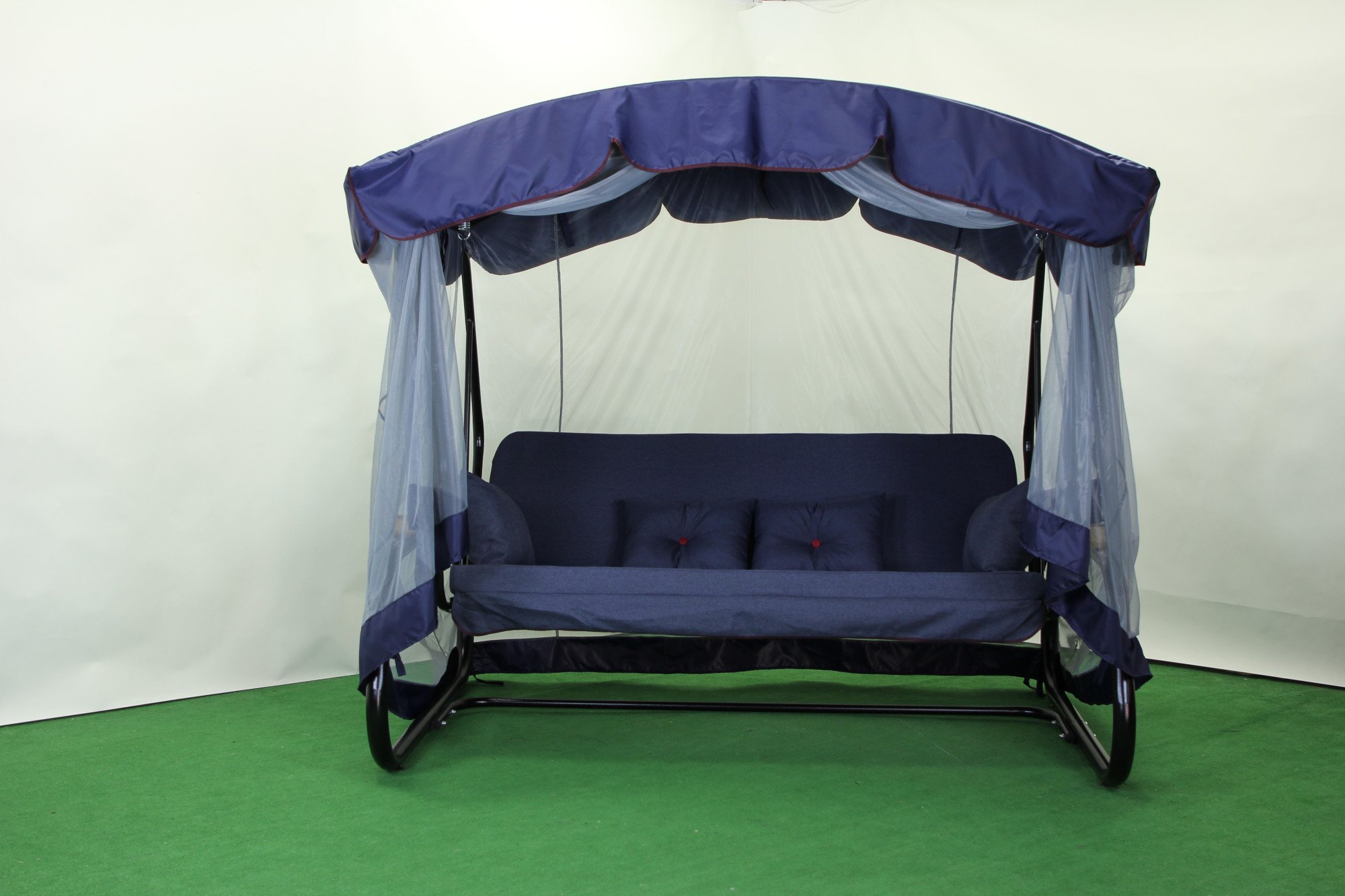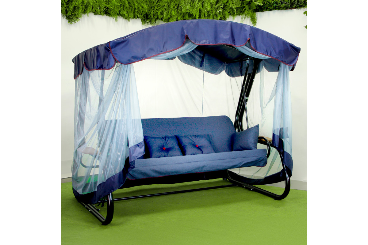 У спекотні дні тент забезпечує захист від сонця, а москітна сітка огортає каркас по всій площі, захищаючи від комах. За потреби сітку можна відстебнути або підв’язати під козирком. Спинка регулюється за нахилом і може повністю розкладатися у горизонтальне положення, перетворюючи гойдалку на просторе літнє ліжко з фіксацією від розгойдування.