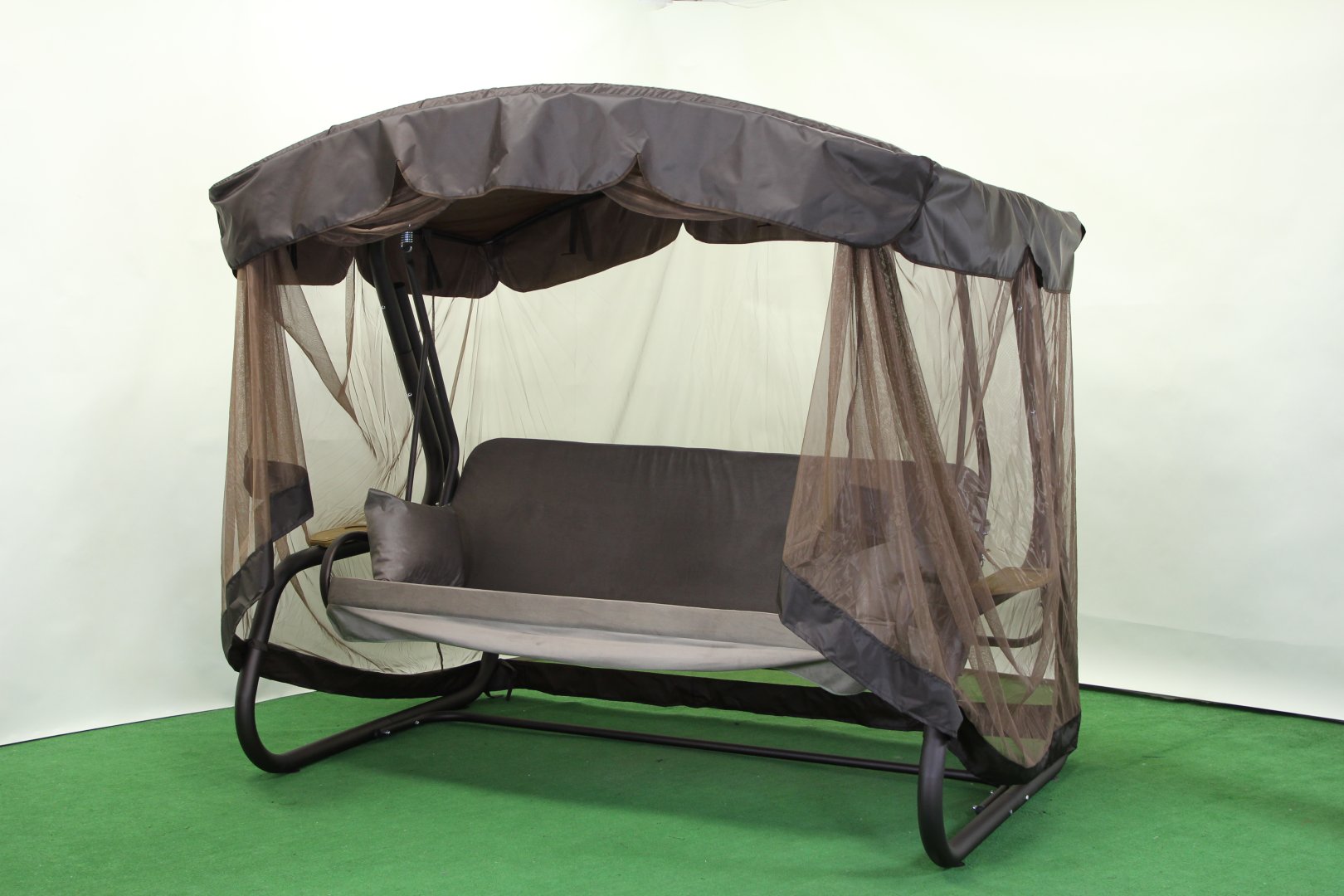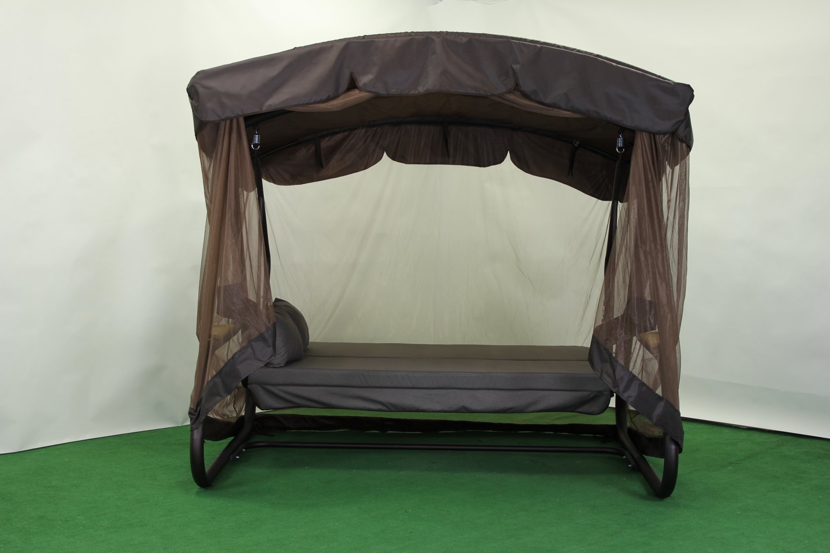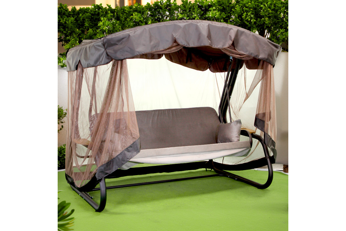 Гойдалку можна використовувати як у стандартному режимі, так і як зручне літнє ліжко: спинка опускається в горизонтальне положення та фіксується від розгойдування. Москітна сітка, що входить до комплекту, повністю закриває каркас і забезпечує захист від комах, а тент створює тінь і захищає від дощу та сонця. За потреби сітку можна підв’язати під козирком або повністю відстебнути.