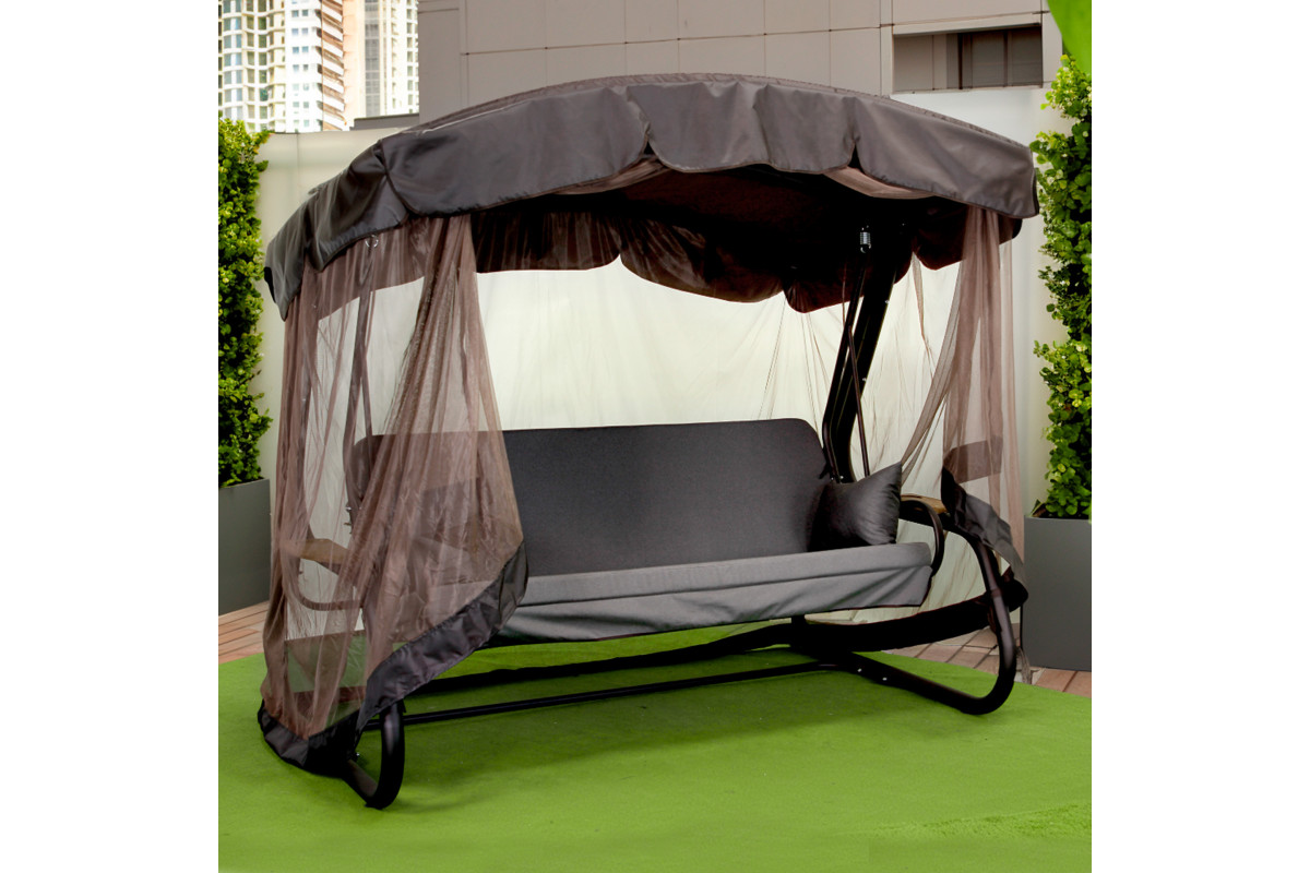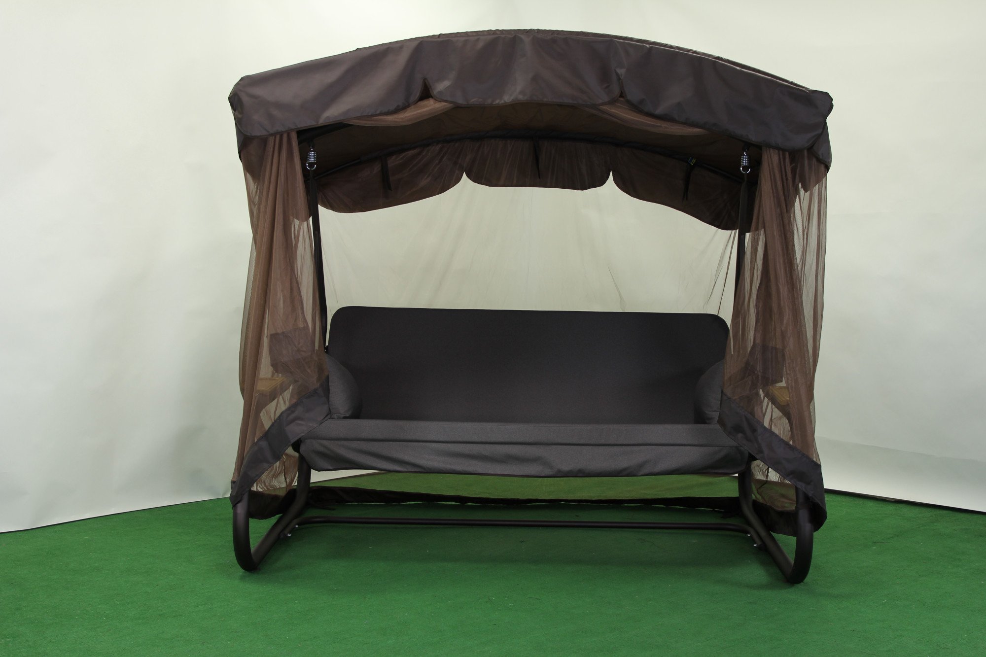Гойдалку можна використовувати як у стандартному режимі, так і як зручне літнє ліжко: спинка опускається в горизонтальне положення та фіксується від розгойдування. Москітна сітка, що входить до комплекту, повністю закриває каркас і забезпечує захист від комах, а тент створює тінь і захищає від дощу та сонця. За потреби сітку можна підв’язати під козирком або повністю відстебнути.