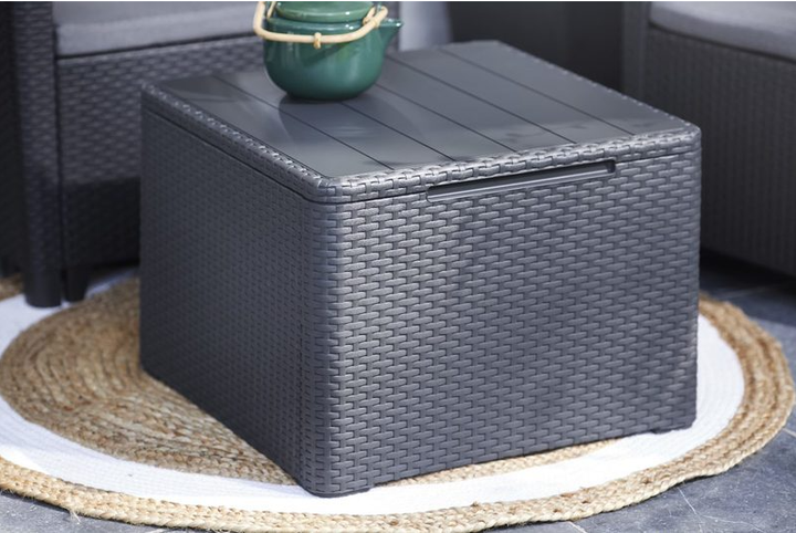 Наявність внутрішнього простору дозволяє зручно зберігати подушки, дитячі іграшки чи садовий текстиль у сухому та захищеному місці. Кришка щільно прилягає, захищаючи вміст від пилу та опадів. Матеріал, з якого виготовлений стіл, не боїться дощу, сонця та перепадів температур, а виріб зберігає привабливий вигляд навіть після тривалого використання на відкритому повітрі.
