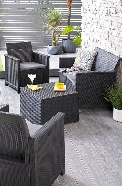 - Стіл-скриня Keter Claire – розумний вибір для тих, хто прагне комфорту та порядку в зоні відпочинку.