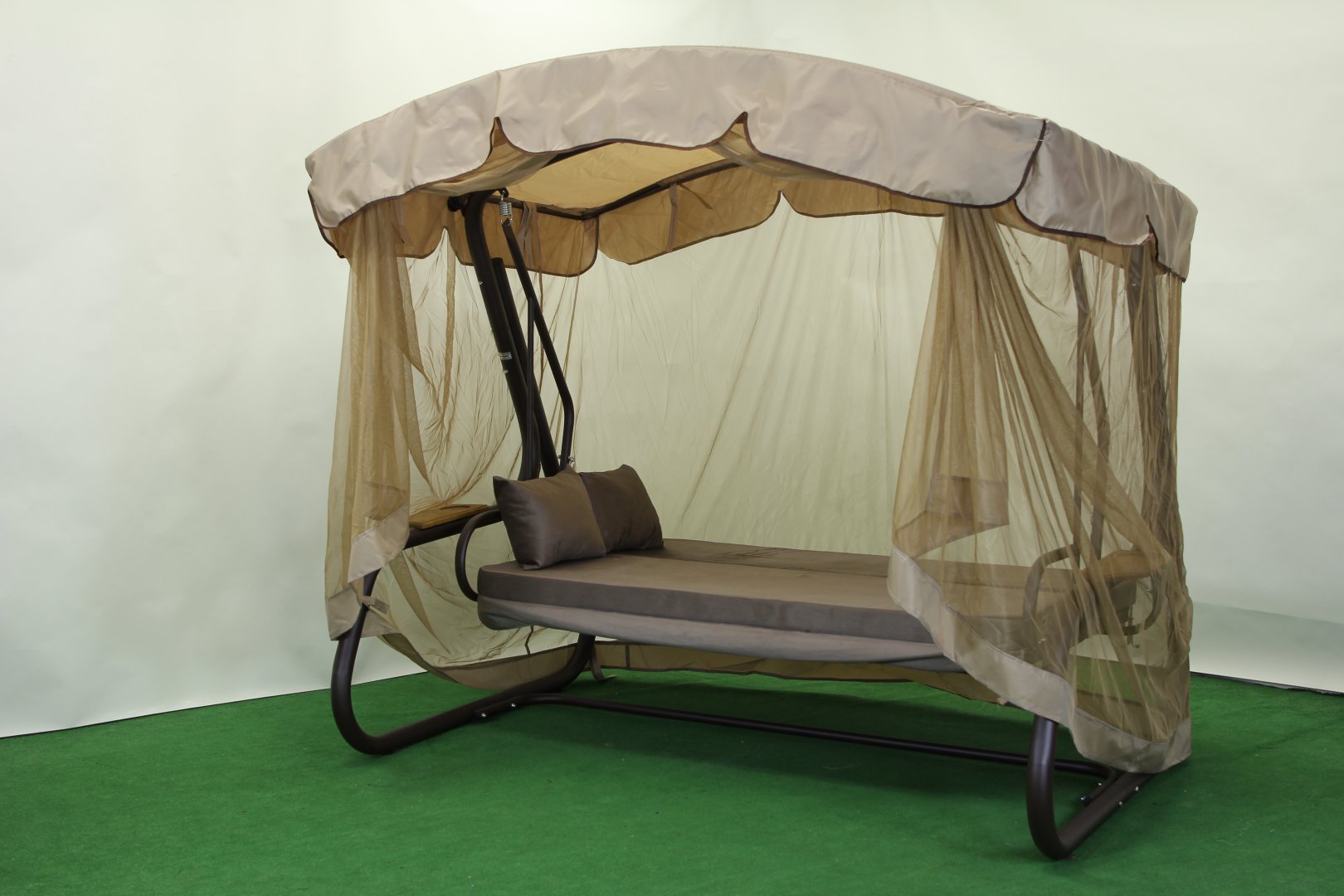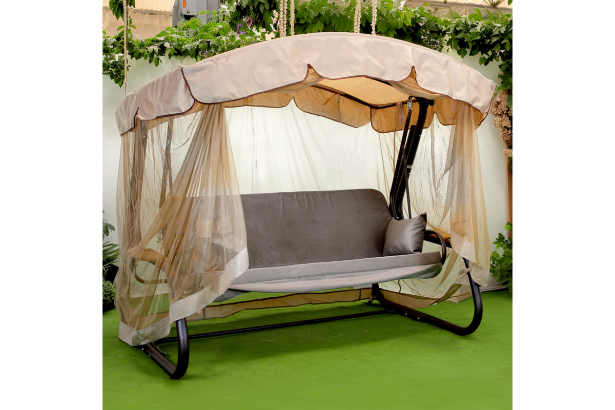 Спинка регулюється за нахилом і може повністю розкладатися у горизонтальне положення, перетворюючи гойдалку на просторе літнє ліжко з фіксацією від розгойдування. У стандартній комплектації передбачено тент і москітну сітку, що закриває каркас по всій площі та забезпечує захист від сонця, дощу й комах. За потреби сітку можна підв’язати під козирком або відстебнути.