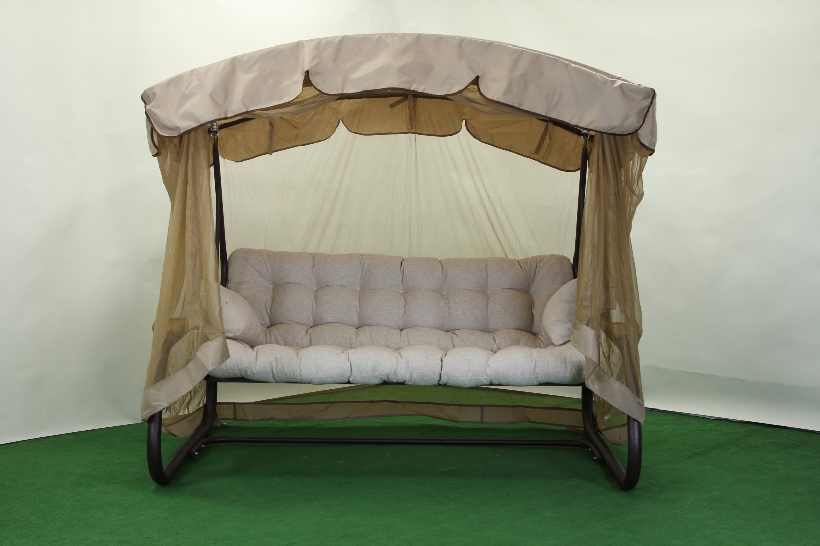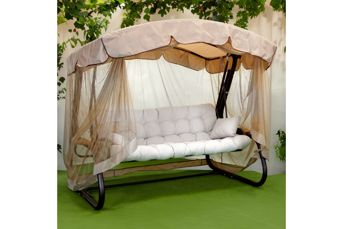 Спинка регулюється за нахилом і може повністю розкладатися у горизонтальне положення, перетворюючи гойдалку на просторе літнє ліжко з фіксацією від розгойдування. У стандартній комплектації передбачено тент і москітну сітку, що закриває каркас по всій площі та забезпечує захист від сонця, дощу й комах. За потреби сітку можна підв’язати під козирком або відстебнути.