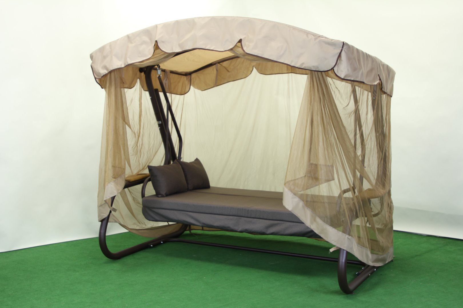 Спинка регулюється за нахилом і може повністю розкладатися у горизонтальне положення, перетворюючи гойдалку на просторе літнє ліжко з фіксацією від розгойдування. У стандартній комплектації передбачено тент і москітну сітку, що закриває каркас по всій площі та забезпечує захист від сонця, дощу й комах. За потреби сітку можна підв’язати під козирком або відстебнути.