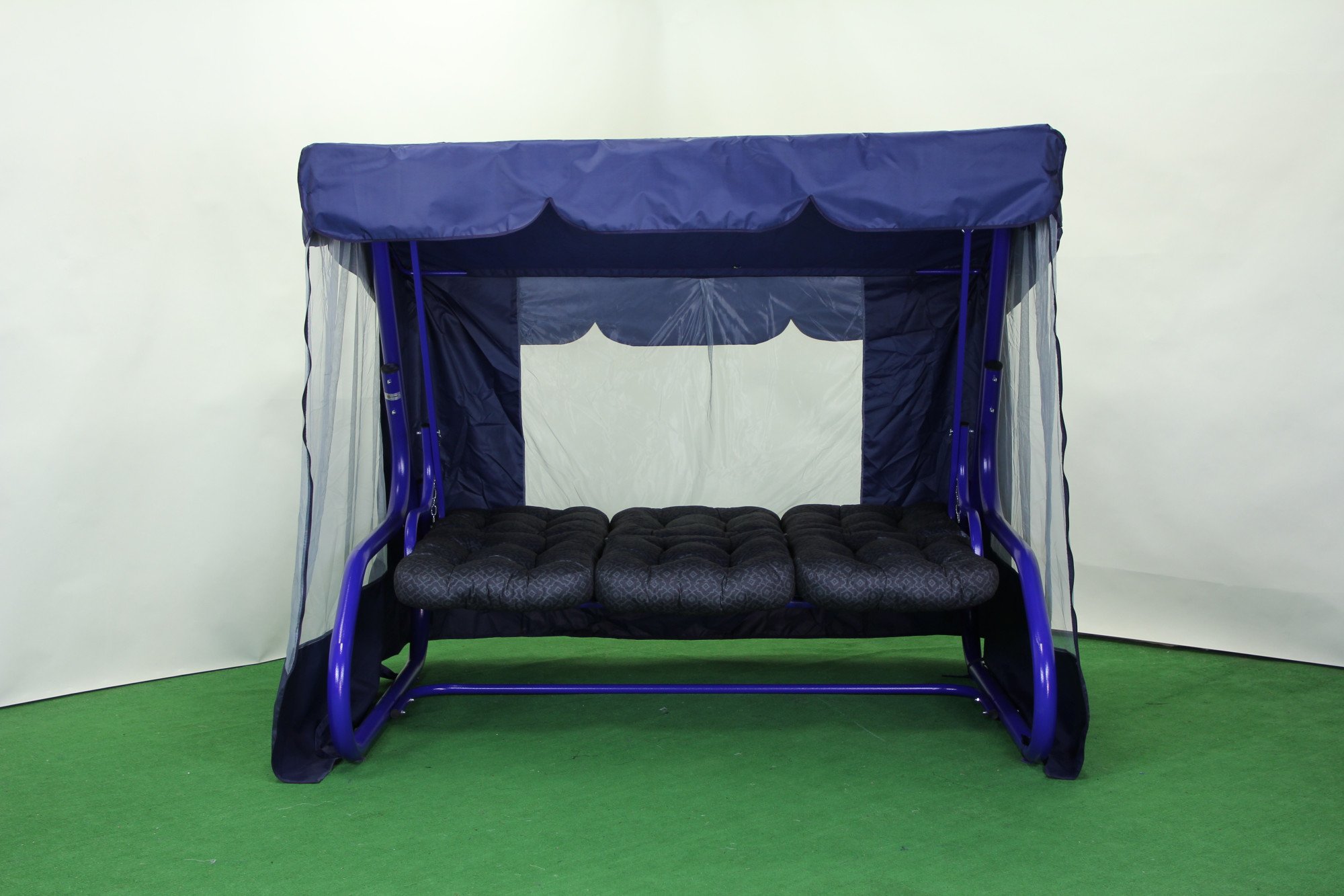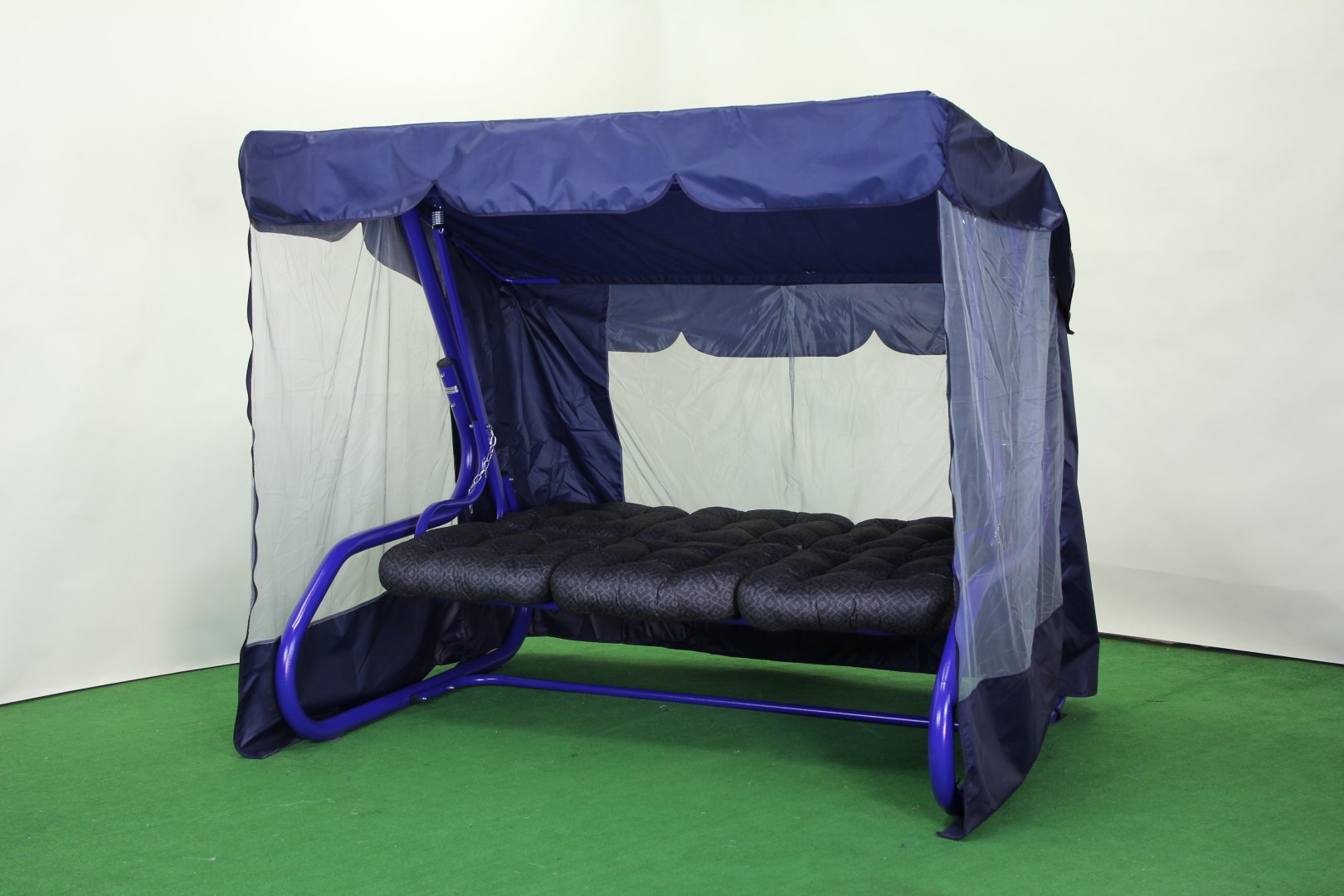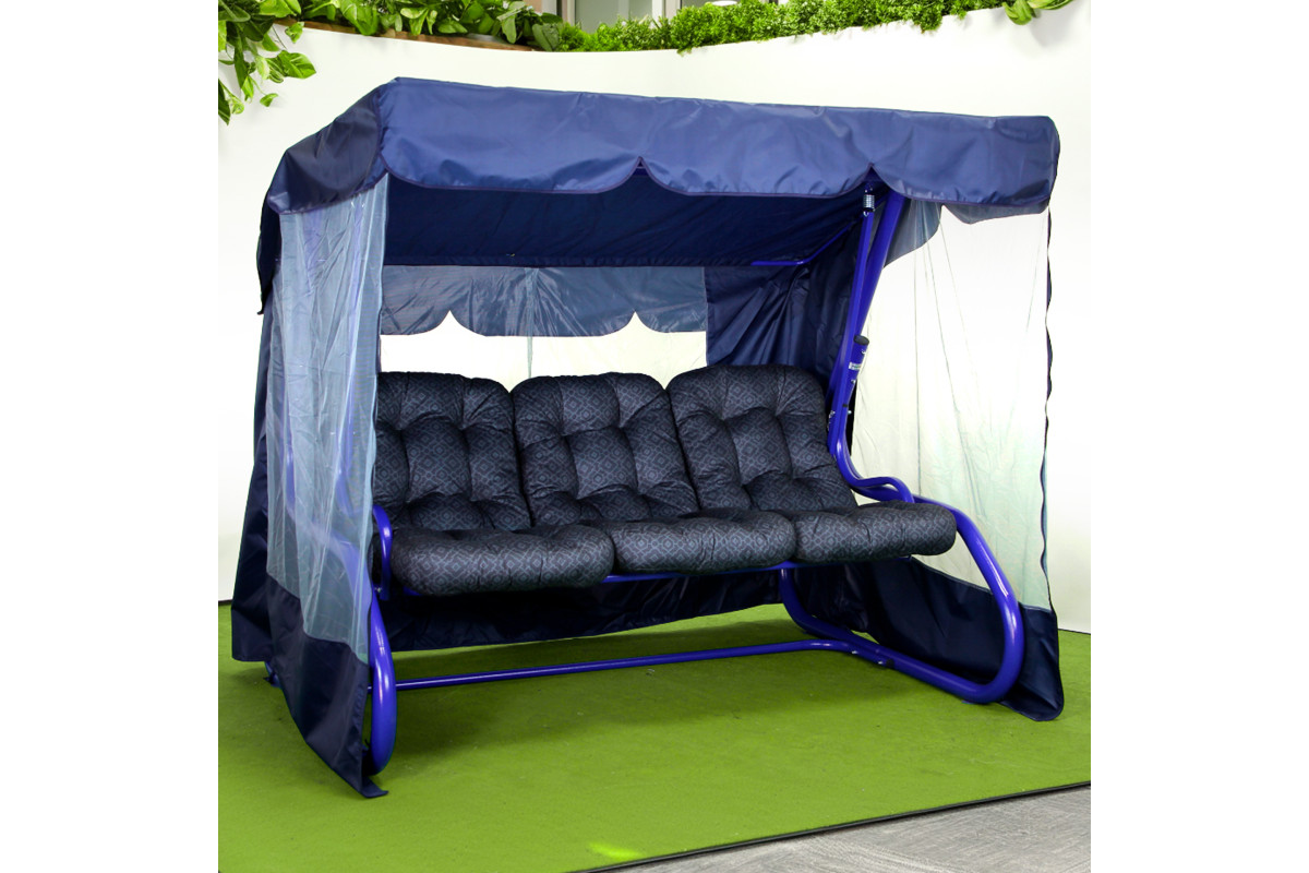 У комплект входять три окремі подушки з меблевого велюру, приємного на дотик і стійкого до зношування. Верхня та нижня частини з’єднані між собою, що запобігає їх зміщенню під час розгойдування чи у розкладеному положенні. Подушки гармонійно доповнюють насичений синій відтінок каркаса, створюючи виразний акцент у зовнішньому інтер’єрі.