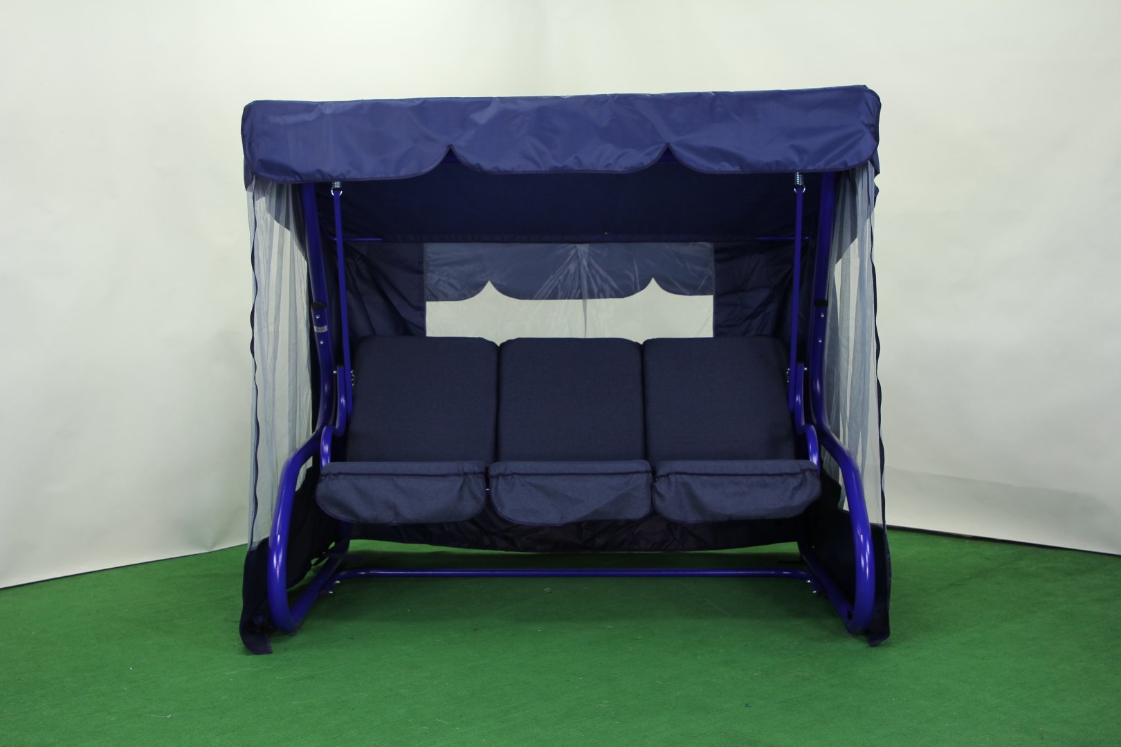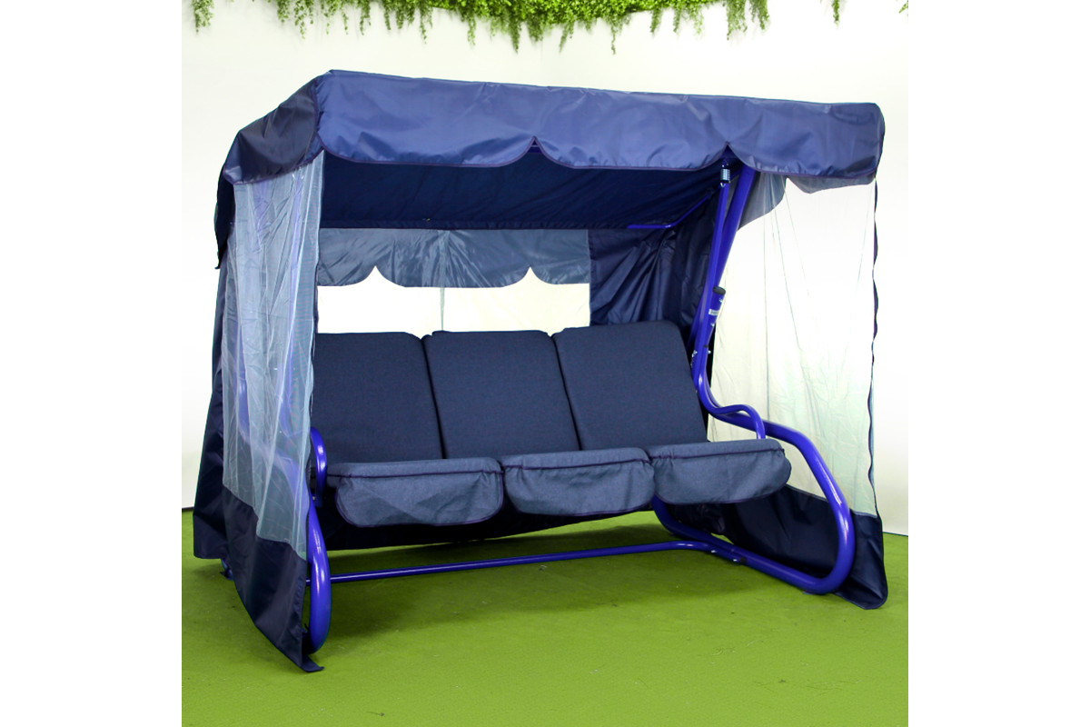 У комплект входять три окремі подушки з тканини «Бязь Голд», приємної на дотик і стійкої до зношування. Верхня та нижня частини з’єднані між собою, що запобігає їх зміщенню під час розгойдування чи у розкладеному положенні. Чохли знімні, їх можна прати в машинці, що полегшує догляд. Подушки гармонійно доповнюють насичений синій відтінок каркаса, створюючи виразний акцент у зовнішньому інтер’єрі.