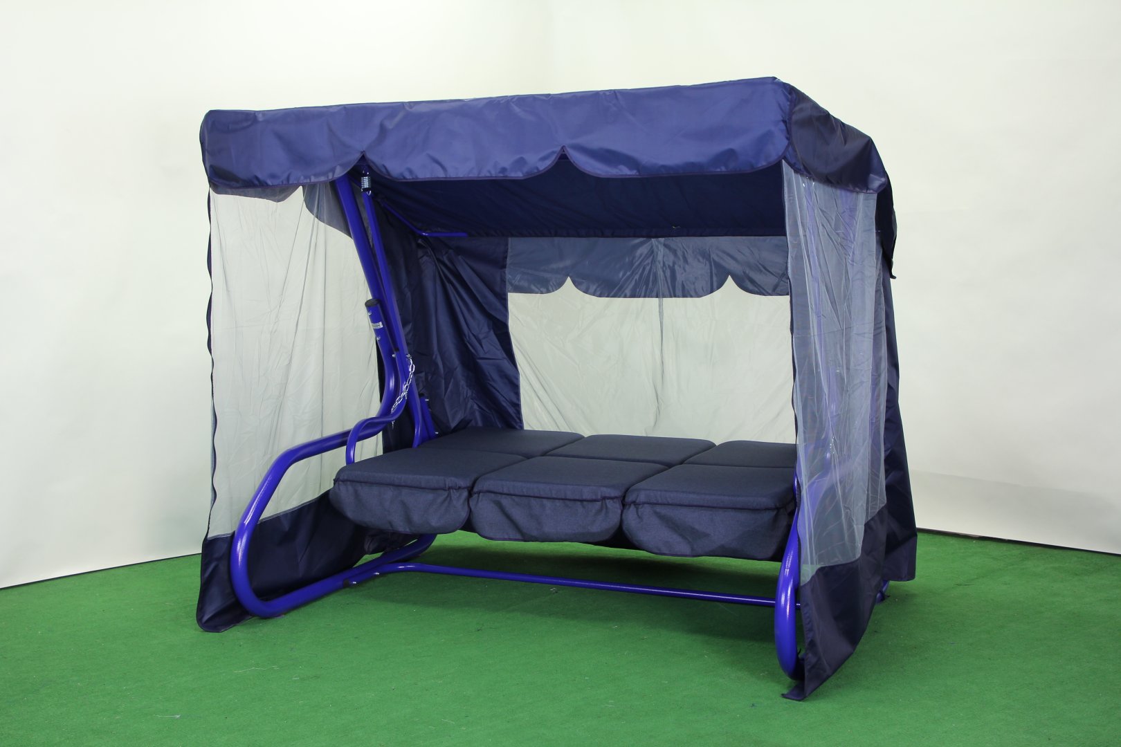 Каркас повністю закривається москітною сіткою та тентом, забезпечуючи захист від комах і сонячного світла. Спинка регулюється за нахилом і може опускатися у горизонтальне положення з фіксацією від розгойдування, перетворюючи гойдалку на зручне місце для відпочинку.