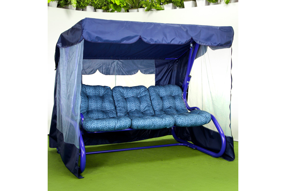 У комплект входять три окремі подушки з меблевого велюру, приємного на дотик і стійкого до зношування. Верхня та нижня частини з’єднані між собою, що запобігає їх зміщенню під час розгойдування чи у розкладеному положенні. Чохли знімні та придатні для машинного прання, що полегшує догляд. Подушки гармонійно доповнюють насичений синій відтінок каркаса, створюючи виразний акцент у зовнішньому інтер’єрі.