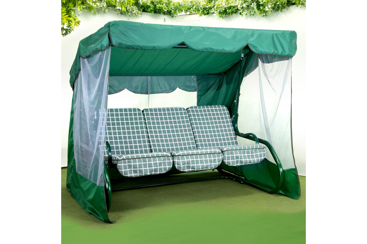 Садова гойдалка GreenGard Таїті вирізняється природною естетикою та гармонійно поєднується з ландшафтом завдяки насиченому зеленому кольору. Вона створює атмосферу спокою та легкості, роблячи відпочинок на свіжому повітрі ще приємнішим. Модель оснащена тентом і москітною сіткою, що повністю закриває каркас і забезпечує захист від сонця та комах. За потреби сітку можна підв’язати під тентом або повністю відстебнути.