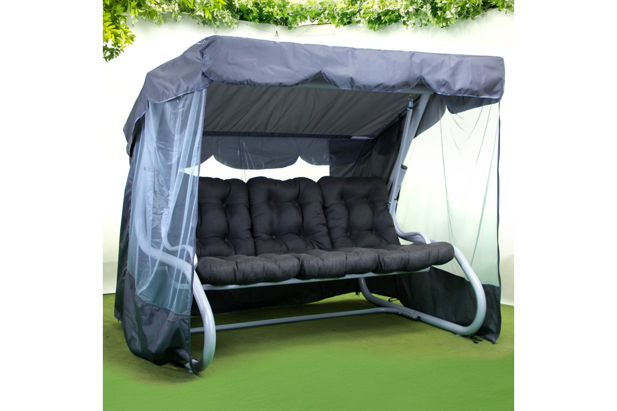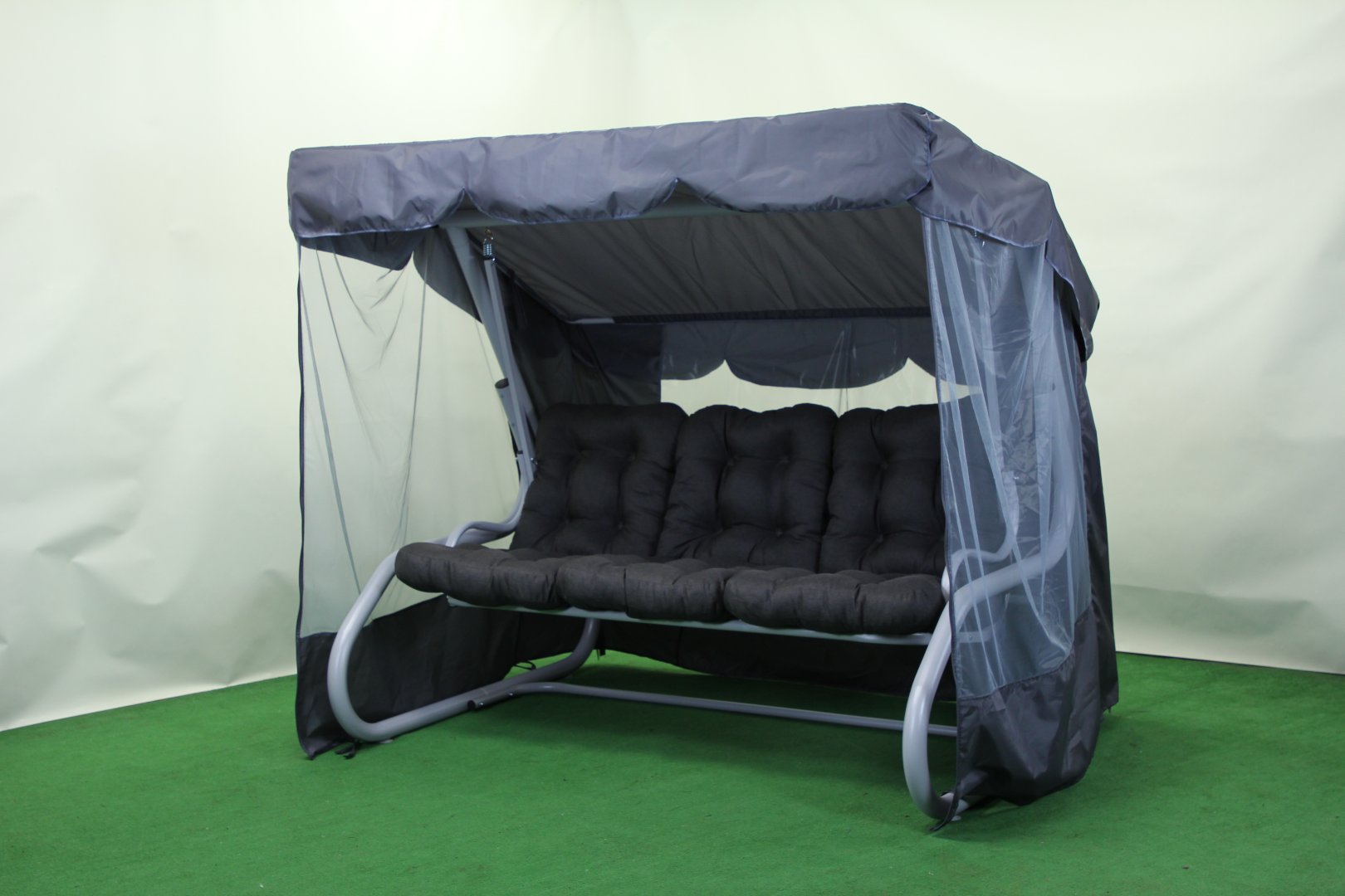 Конструкція витримує навантаження до 400 кг, що робить модель зручною для сімейного відпочинку. Спинка розкладається у горизонтальне положення та фіксується від розгойдування, перетворюючи гойдалку на комфортне літнє ліжко. Москітна сітка, що входить у комплект, повністю закриває каркас і забезпечує захист від комах.