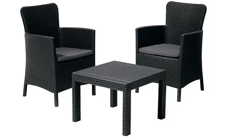Набір садових меблів (два крісла + столик) Keter SALVADOR – це балконний комплект, фактура поверхні якого нагадує плетіння з ротангу. До його складу входять два крісла та квадратний столик. Ергономічно профільована спинка крісел та м'які подушки зроблять відпочинок на свіжому повітрі надзвичайно приємним. Легкий в очищенні меблевий комплект є довговічним i стійким до дії несприятливих атмосферних факторів та УФ-випромінювання.
