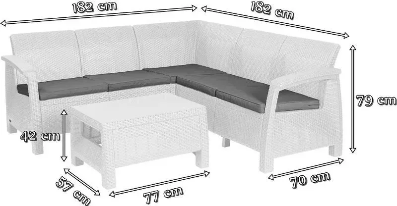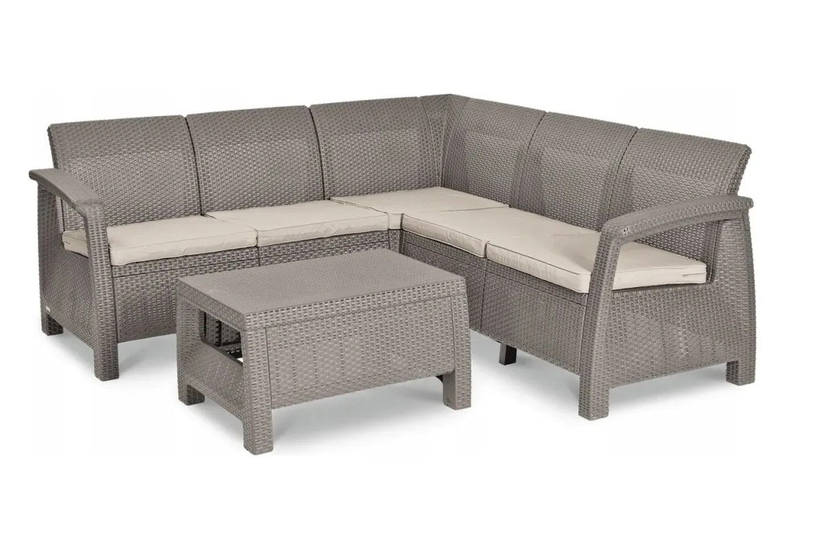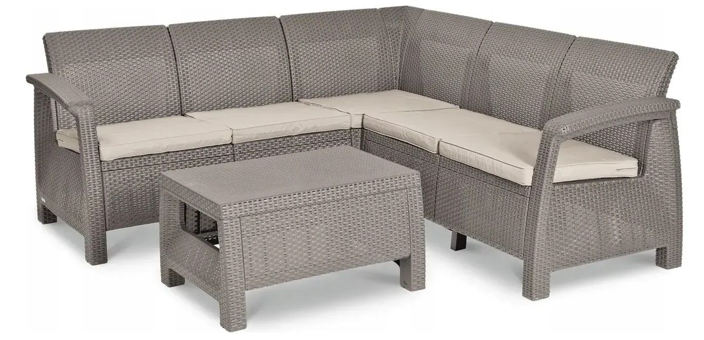 Набір пластикових садових меблів Keter Corfu Relax. Елегантність і функціональність в одному комплекті! Виконаний з високою ретельністю кутовий комплект Corfu Relax set, що складається з зручного дивана і стильного столика, забезпечить користувачам максимальний комфорт використання. Меблі легкої, але стійкої конструкції, виконані з високоякісного полімеру, стійкого до впливу несприятливих погодних умов / Оригінальна текстура меблів, що нагадує ротангове плетіння, профільоване сидіння і м'які подушки безумовно є перевагою даного продукту.