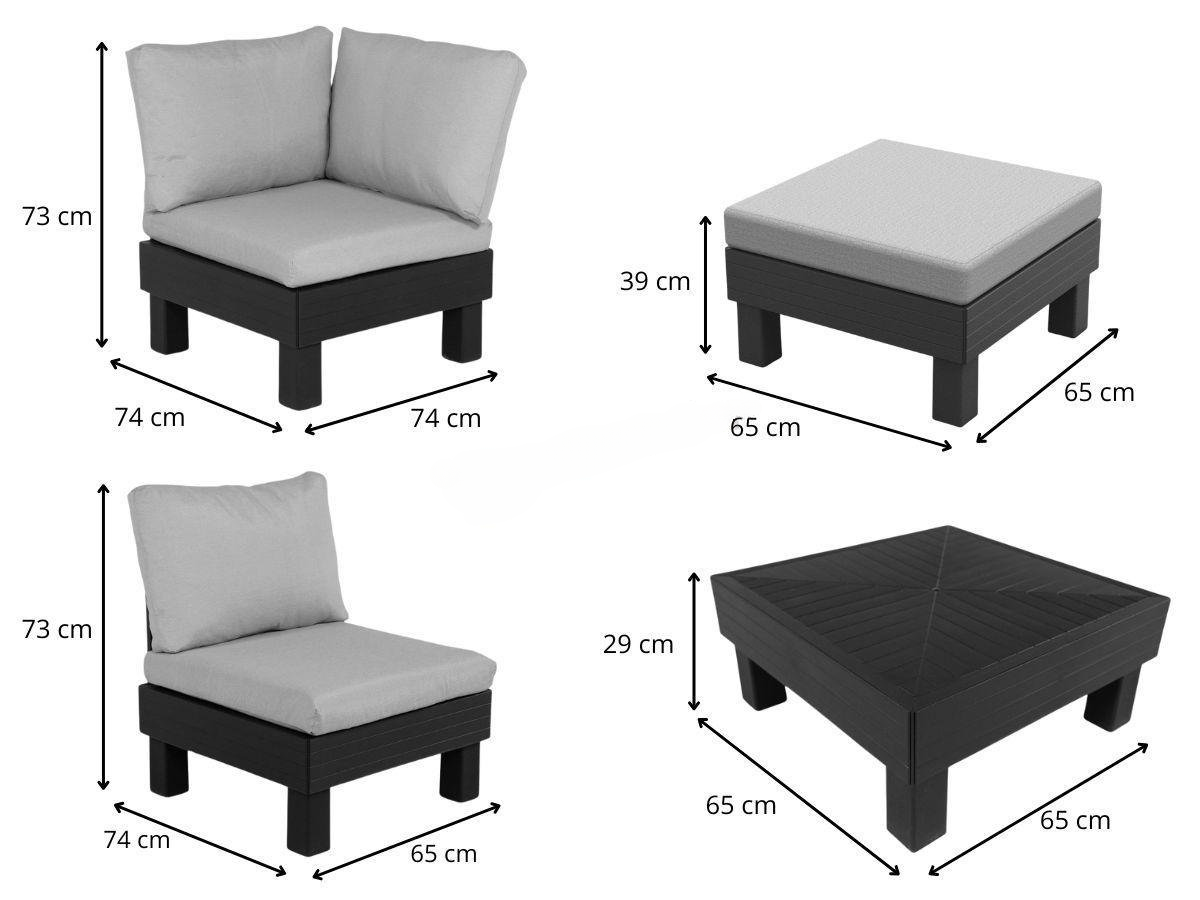 Для ще більшого комфорту в комплект входять подушки та спинки висотою 9 см. Подушки зроблені з приємного матеріалу полікотон, а нижня частина виконана з нетканого матеріалу з протиковзкими точками. Твердий формований пластик, з якого виготовлений набір, стійкий до несприятливих погодних умов і УФ-випромінювання.