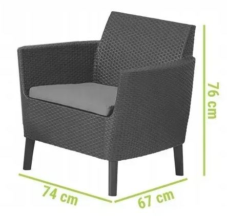 Комплект стійкий до погодних явищ. Чи не вигоряє на сонці. Комплект меблів Salemo 2-sofa - один з найбільш зручних комплектів меблів з поліпропілену. Диван і крісла дозволять зручно розміститися гостям, а високі спинки меблів створюють прекрасні умови для відпочинку на відкритому повітрі. Залишилося тільки зробити кольорові акценти за допомогою подушок або аксесуарів.